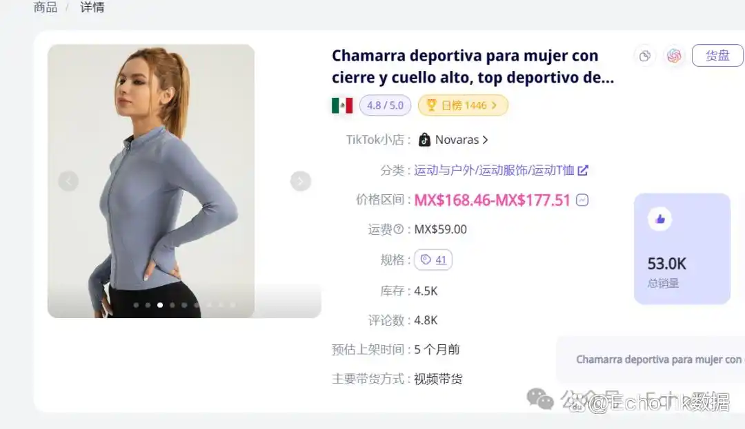 更在质量和价格上找到平衡点 —— 比如爆款 “NO.1 女士带拉链高领运动夹克”,既满足了墨西哥气候下的保暖需求,又兼顾了日常穿搭的时尚感,最终创下 TikTok 墨西哥站 23.7k 周销的成绩,连续多周蝉联销量冠军。