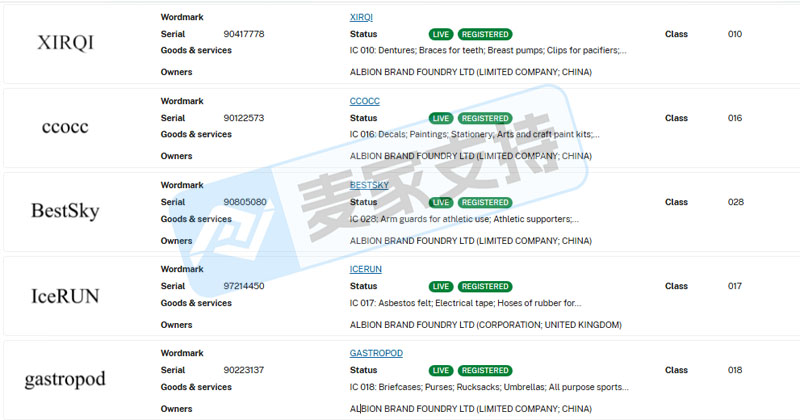 Albion Brand Foundry LTD是英国一家综合型电商企业,在美国注册成功注册了 XIRQI、CCOCC、BestSky、IceRUN 以及 gastropod 等 5 个商标,分别涵盖第 10、16、28、17 和第 18 大类,广泛涉及医护用品、背包雨伞等日用品、文具用品、运动健身用品以及五金百货类等多个热门领域,产品矩阵丰富多样,并通过Walmart等第三方电商平台进行销售,满足不同消费者的多样化需求。