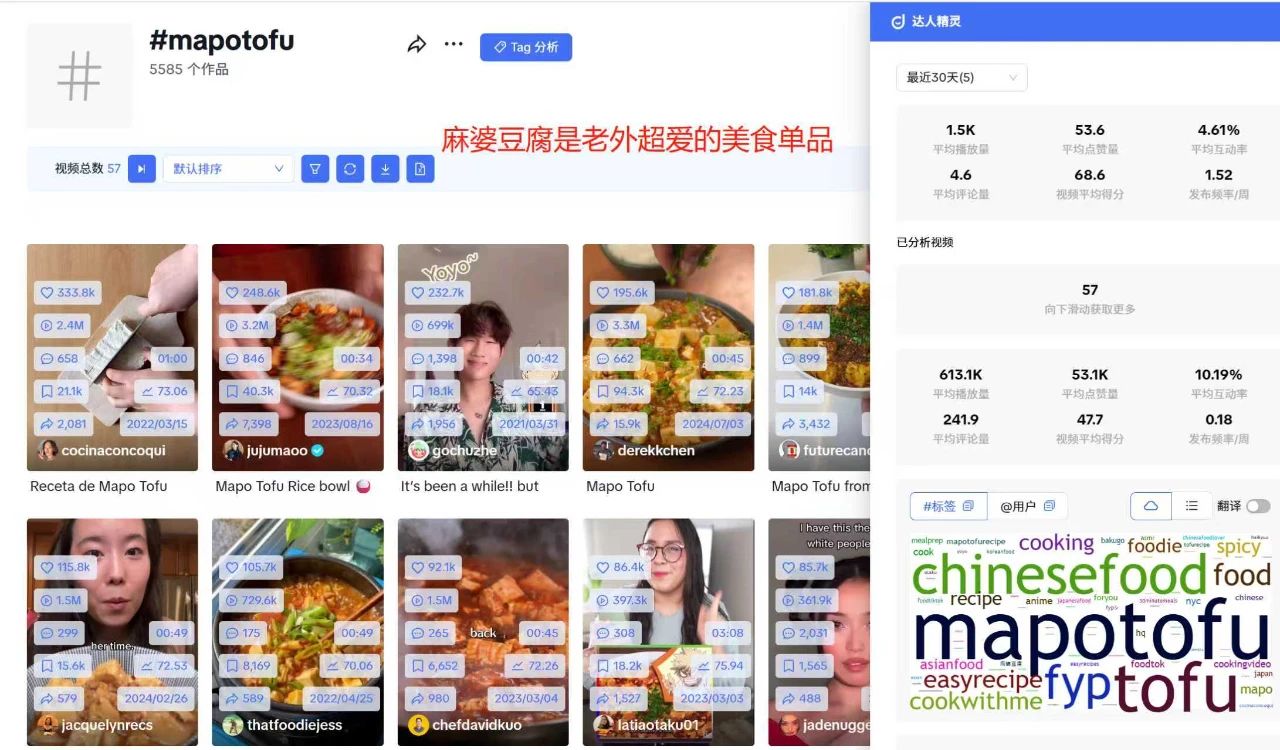 标签3:Mapotofu (麻婆豆腐):相关视频点赞量几十万、上百万的比比皆是。这说明即使是单个菜品,也有巨大的爆发力。