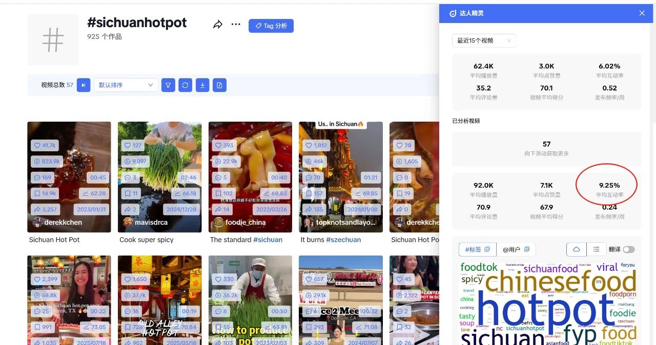 标签2:sichuanhotpot:互动率高达11.05%!这意味着老外对“四川火锅”这个细分话题的参与度极强,他们不仅仅是看,还会点赞、评论、分享。这是一个高转化的标签,也是最容易抓住的流量。