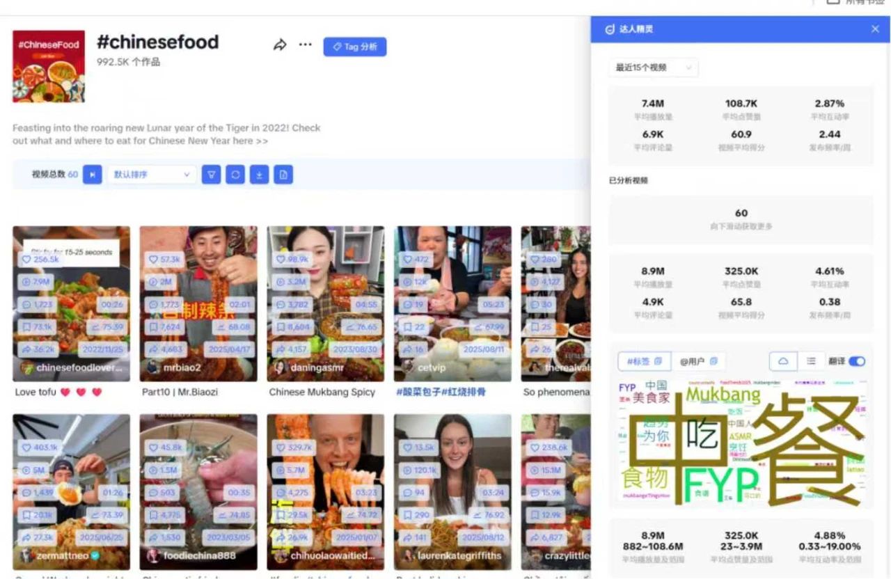 在达人分析功能中,会统计达人近期视频中的常用标签,同时还会提供与这些标签相关的视频播放量、完播率、评论量、互动率等关键指标,让用户了解每个标签的传播效果和影响力。