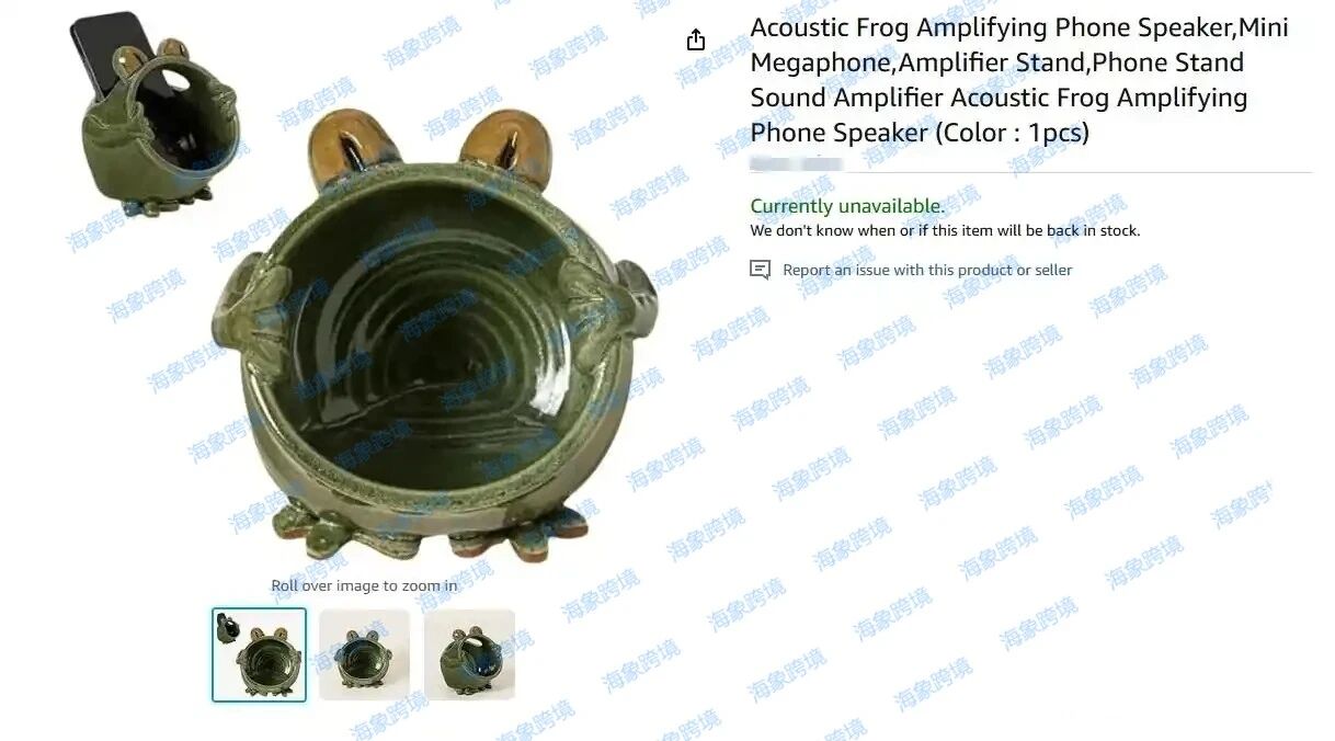 的素坯陶器。本案涉及版权图如下,是一款陶瓷青蛙手机支架扩音器,请相关卖家注意排查