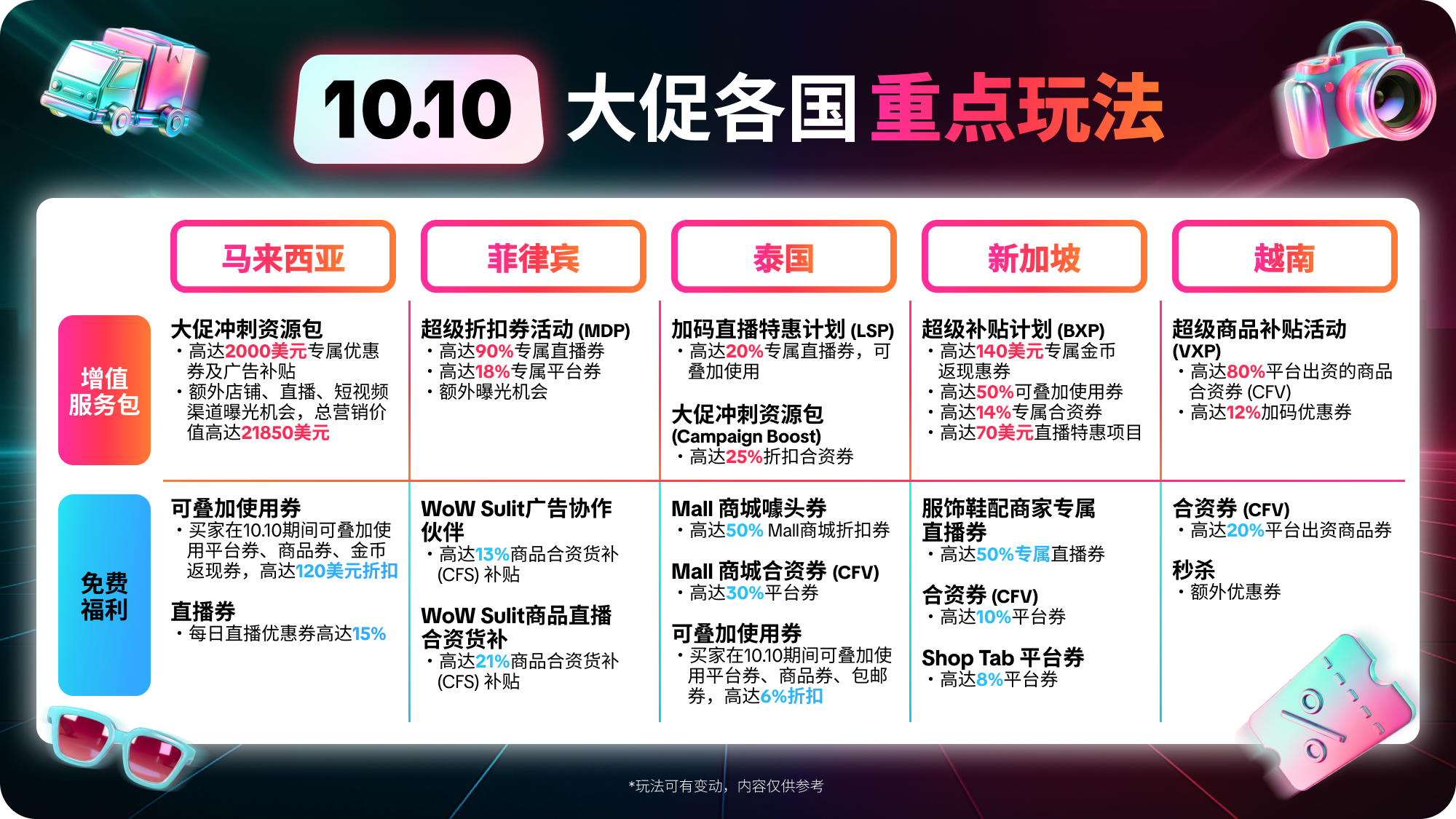 10.10大促的倒计时现已启动 --- 各位商家可参照下图各市场的活动节点,踊跃参与大促的各种玩法与项目!千万不要错过从 10月1日 至 10月12日 的 10.10 大促!