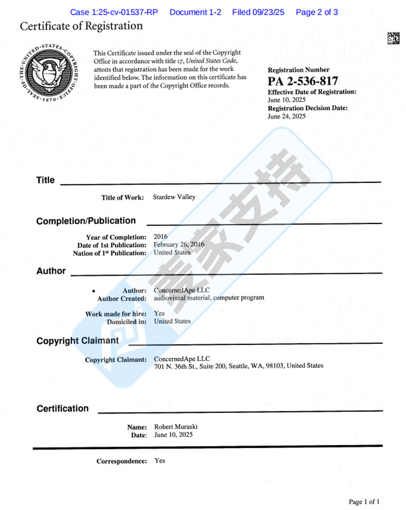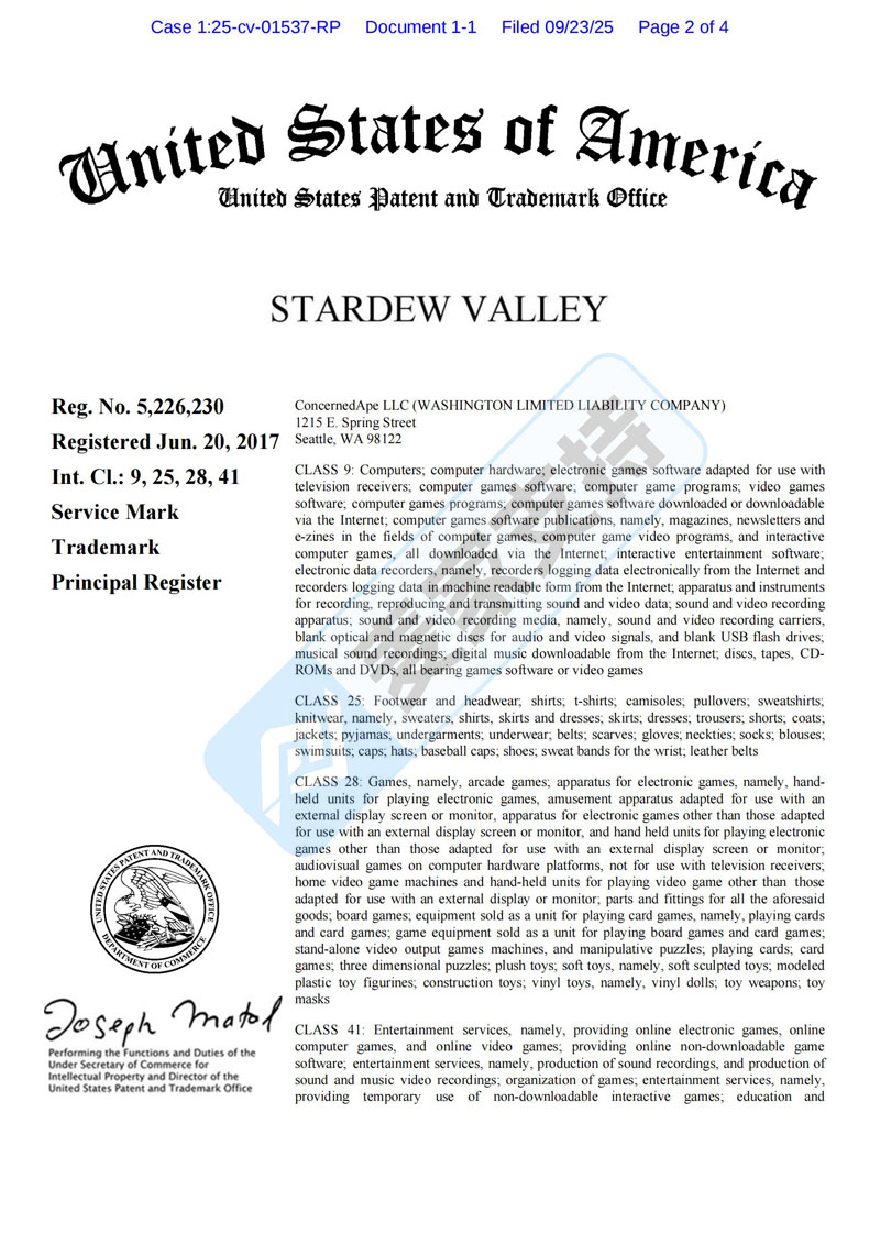 本案是Argd律所代理ConcernedApe LLC针对未经授权使用Stardew Valley商标及其版权的行为发起的跨境维权,涉案商标Stardew Valley注册版权号为5226230,注册在第9、25、28以及41大类,涵盖鞋服、饰品、游戏以及娱乐等多个类目。除此之外还注册有PA 2-536-817版权,未经授权使用则会面临TRO冻结风险!