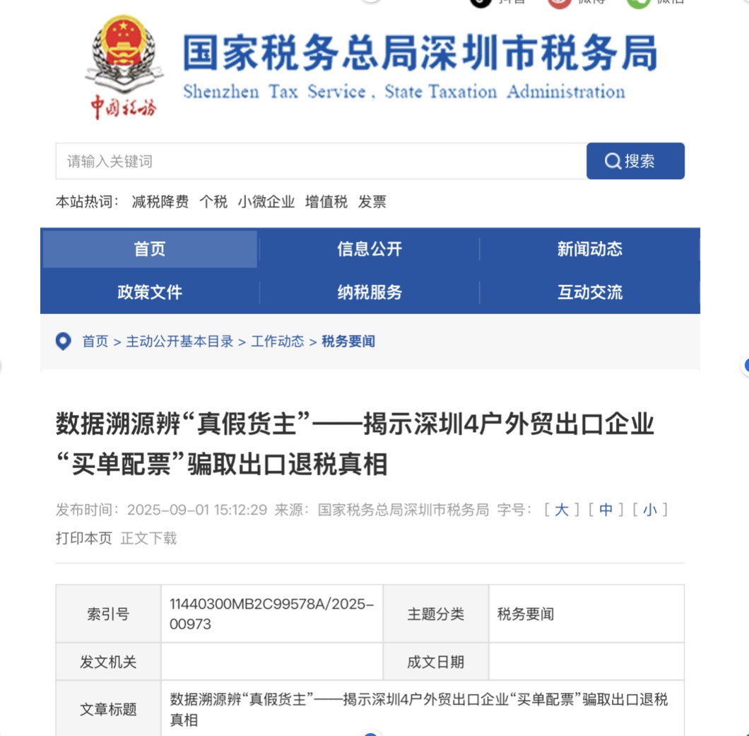 税务监管新趋势:数据治税成为利器 此案的成功查处,展现了税务部门运用大数据精准监管的成效。通过多维度数据比对分析,税务机关能够迅速发现异常线索;通过资金流水溯源,可以准确识别虚开行为;通过物流信息追踪,更能还原真实货主与“假货主”的区别。 在当前税收监管环境下,企业应当更加注重合规经营,任何企图通过违法手段获取不正当利益的行为,最终都将受到法律严惩。 易税通提醒:随着税收监管越来越精准化、智能化,企业需要更加重视税务合规建设。易税通拥有专业的税务团队和智能财税工具,能够为企业提供全方位的税务风险诊断和合规规划服务,帮助企业在享受政策红利的同时,筑牢税务风险防火墙,实现稳健发展。 天网恢恢,疏而不漏。税务违法带来的不仅是经济上的损失,更可能面临刑事追究。 诚信纳税、合规经营,才是企业长远发展之道。 【本文来源:根据国家税务总局深圳市税务局公开信息整理,案例仅供参考】 企业税务合规方案请咨询当地主管税务部门,或者寻求专业服务机构协助。