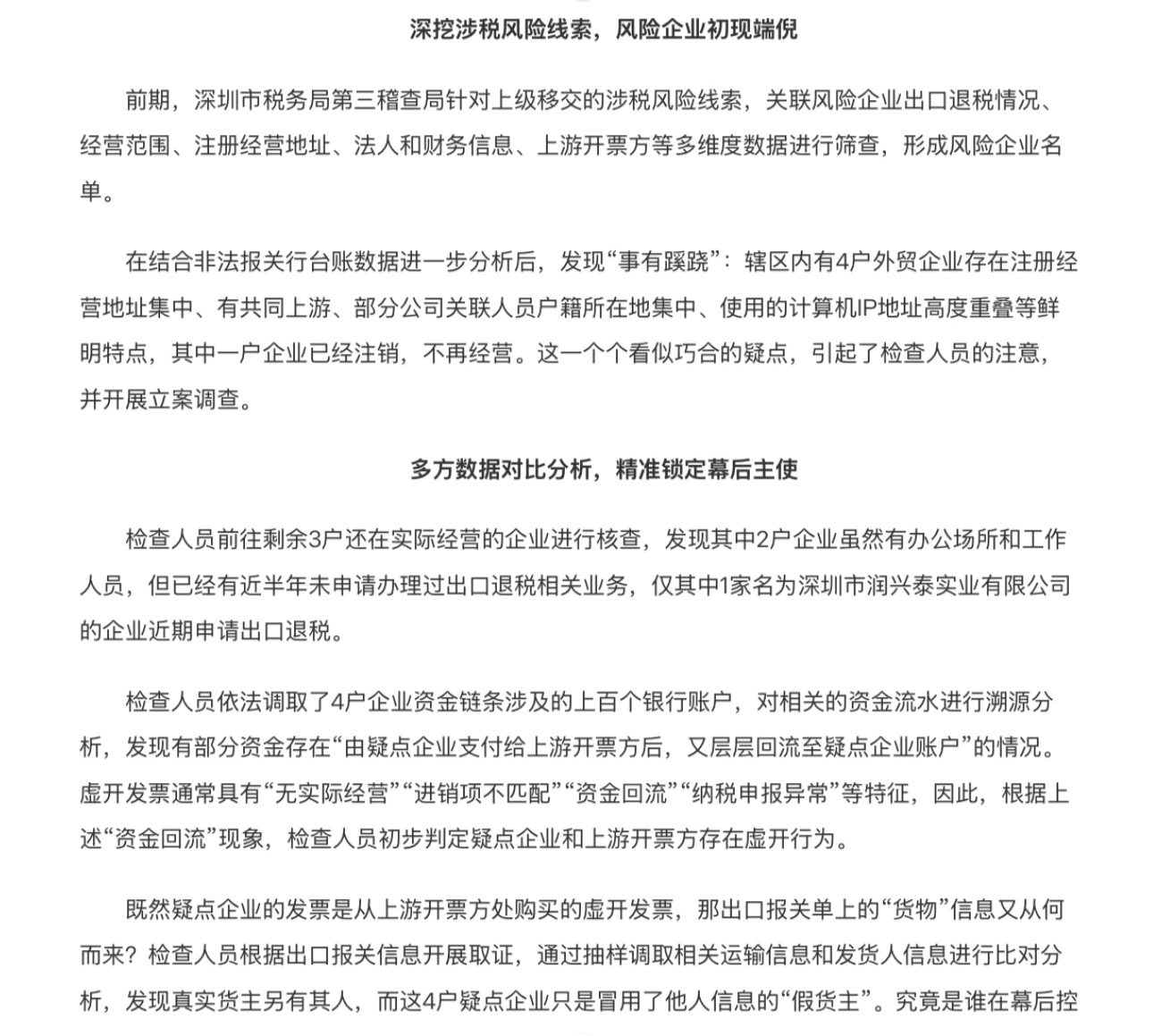 深挖线索:风险企业初现端倪 案件起初源于上级移交的涉税风险线索。稽查人员通过对企业出口退税情况、经营范围、注册地址、法人和财务信息等多维度数据进行筛查,发现4户外贸企业存在惊人相似点:注册经营地址集中、有共同上游供应商、部分公司关联人员户籍所在地集中,甚至使用的计算机IP地址也相同。 更为可疑的是,其中一户企业已经悄然注销,不再经营。这些异常现象引起了检查人员的高度警觉,随即决定立案调查。 数据溯源:精准锁定犯罪手法 检查人员对3户仍在经营的企业进行实地核查,发现其中2户近半年未申请出口退税,只有深圳市润兴泰实业有限公司近期还在申请退税。 通过对4户企业资金链条涉及的上百个银行账户进行溯源分析,检查人员发现了典型虚开发票特征:资金从疑点企业支付给上游开票方后,又层层回流至疑点企业账户。 那么,既然发票是购买的,出口报关单上的“货物”从何而来?通过抽样调取运输信息和发货人信息进行比对,检查人员发现真实货主另有其人,这4户企业只是冒用他人信息的“假货主”。
