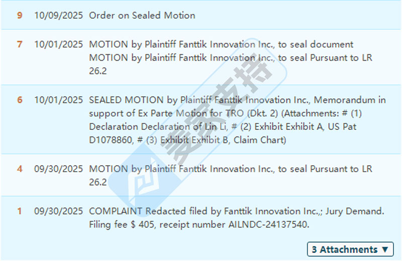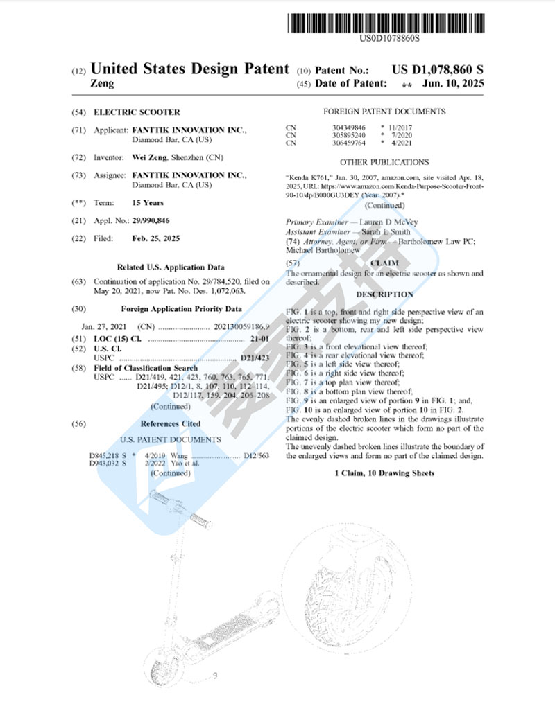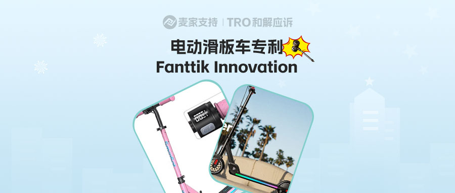 本案是Fanttik Innovation Inc委托Rimon PC发起的密封专利维权案件,麦家支持通过排查文件发现,涉案专利为该公司于2025年6月10日获得美国专利认证的电动滑板车外观专利,专利号为:D1078860,目前原告已申请了TRO临时限制令,暂未获批,跨境卖家需尽快排查,并做好应对之策!关注我们可跟进案件后续进展!