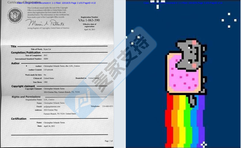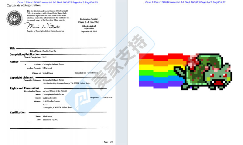 本案是Nixon Peabody LLP代理Nyanify, Inc. and Christopher Orlando Torres针对Nyan Cat版权发起的跨境维权,涉案版权号为:Vau 1-063-390和 VAu 1-114-946等。继22年的版权维权后,时隔三年的再次回归,跨境卖家应提高警惕,未经授权使用其版权图案以及商标词,均会面临侵权风险!