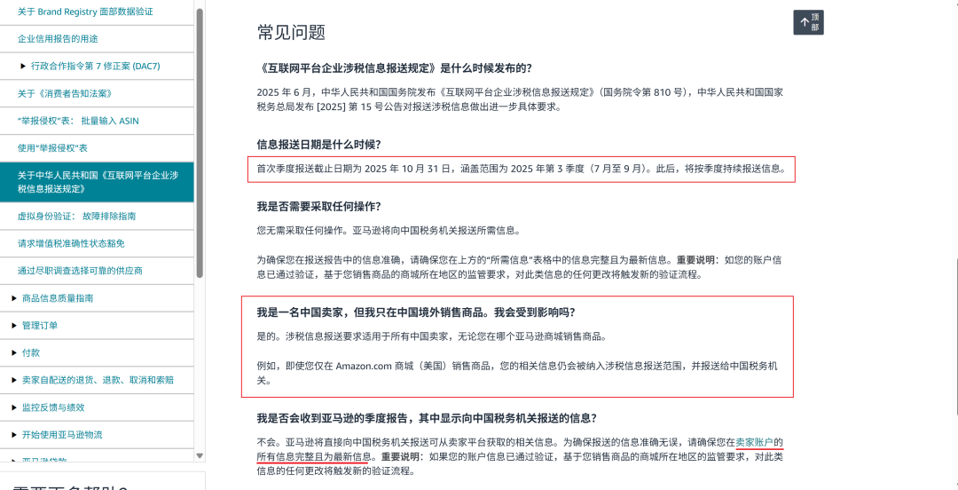 “根据中华人民共和国国务院发布的《互联网平台企业涉税信息报送规定》(国务院令第810号)及中华人民共和国国家税务总局发布的[2025]第15号公告,亚马逊将按季度向中国税务机关报送中国卖家的相关信息。