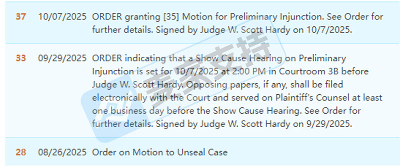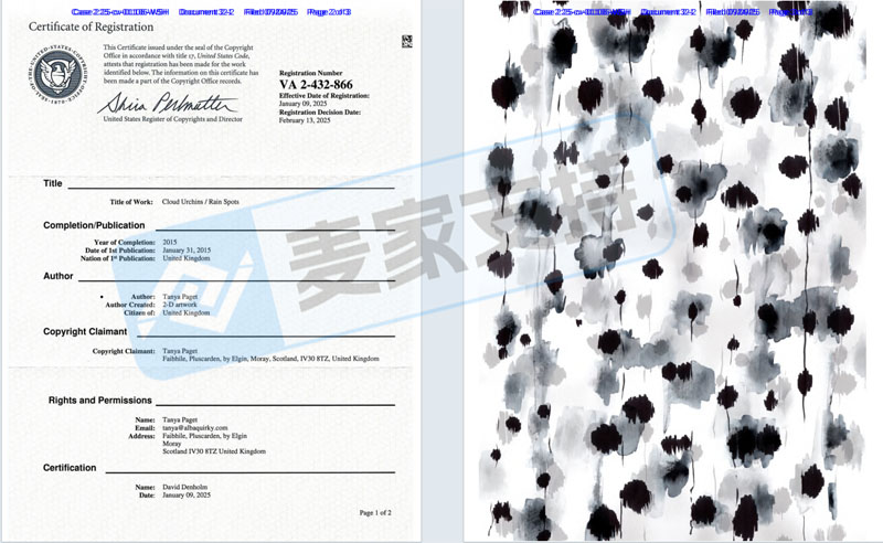 本案是Ference & Associates LLC联合keith律所在宾夕法尼亚州发起的版权维权案件,涉案版权为一幅黑白水墨抽象画,版权号为:VA0002432866,于2025年1月9日取得美国版权证书。该作品被广泛用于服饰印花中,本次案件共有79店因误用该版权图而导致账户资金被TRO冻结,目前该案件已进入初步禁令阶段,已收到传票的卖家需尽快处理,避免后续案件缺席判决后被划扣账户资金!