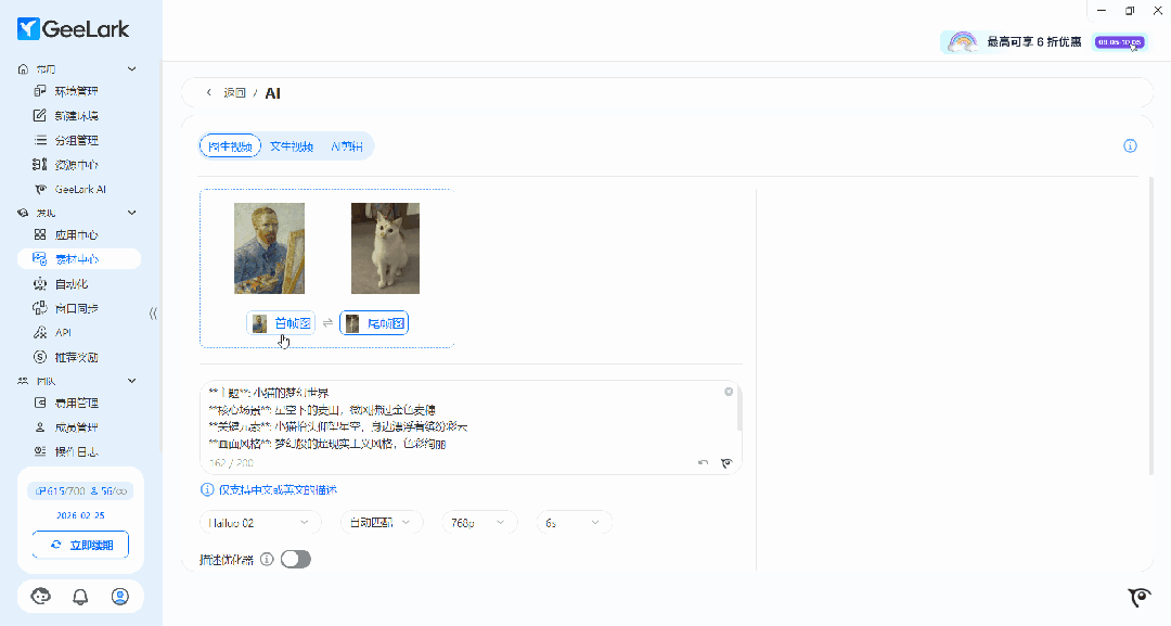 在 GeeLark 最新版本中,Hailuo 02 大模型也支持首尾帧图片生成视频了。你可以通过自己的需求选择合适的 AI 大模型,上传不同的首帧和尾帧图,通过文字描述让 AI 生成符合你运营领域的视频内容。
