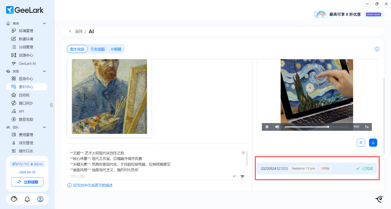 你可以选择 Veo3 / Seedance 1.0 Pro / KLING 2.1 Master / Hailuo 02 / Seedance 1.0 lite 大模型完成你的文生视频任务,现在,GeeLark AIGC 能够满足用户从文字、图片到视频的全方位内容创作需求,不断提高你的跨境运营效率。
