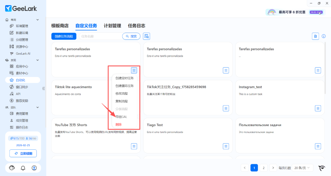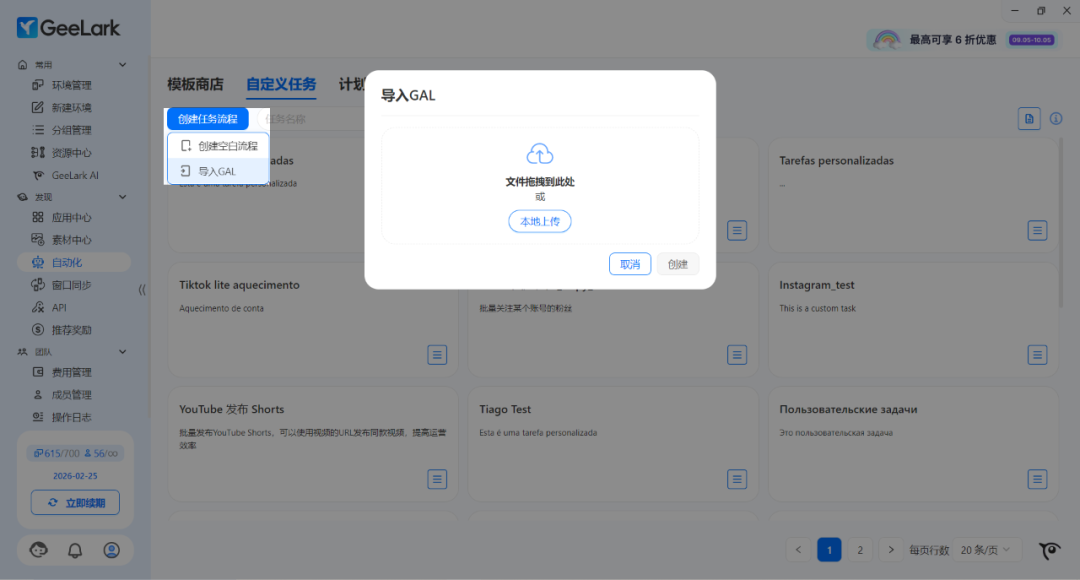 在 GeeLark 最新版本中,你可以通过自动化-自定义任务中导入导出 GAL(GeeLark Automation Language)文件进行获取/分享模板。 你可以将常用的、经过验证的流程保存为模板,在新项目中直接导入使用,无需重新编写,极大节省开发时间。