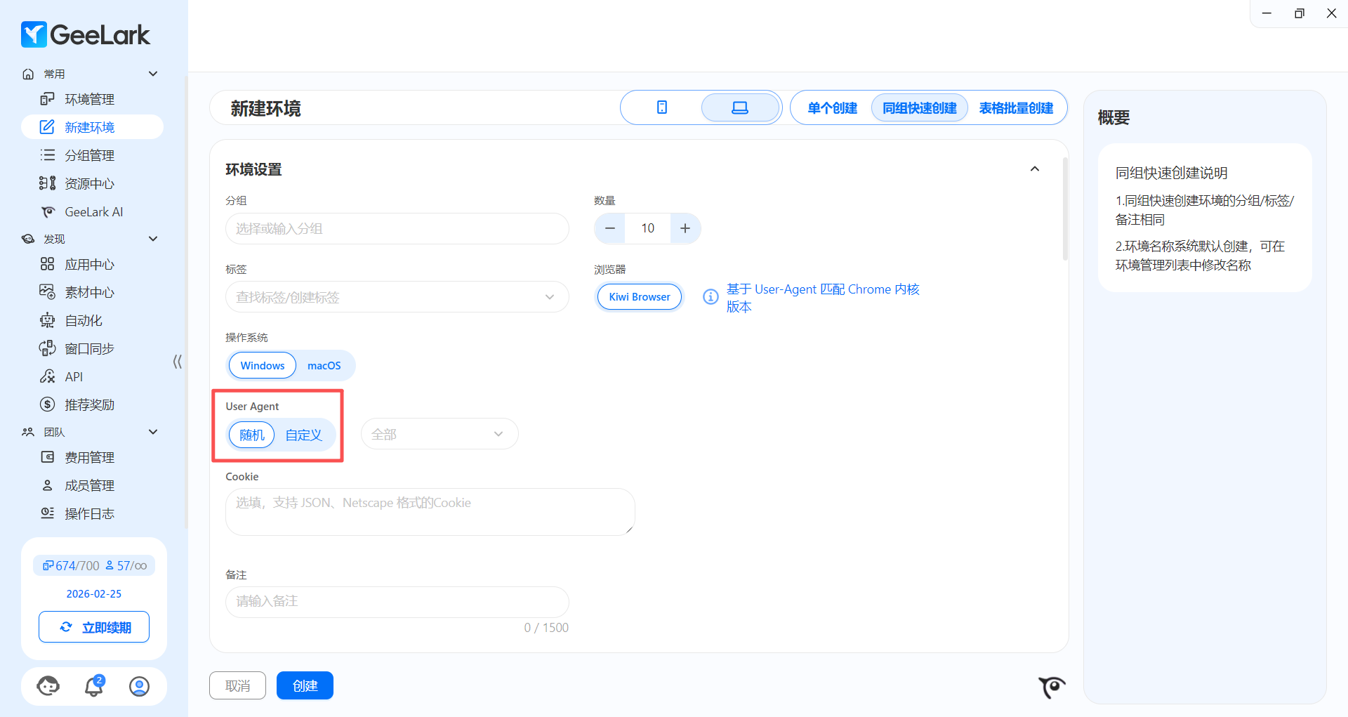 在 GeeLark 最新版本中,浏览器同组快速创建与表格批量创建均支持随机 UA 和指纹,用户可通过该功能快速创建多个具有不同指纹信息的浏览器环境。