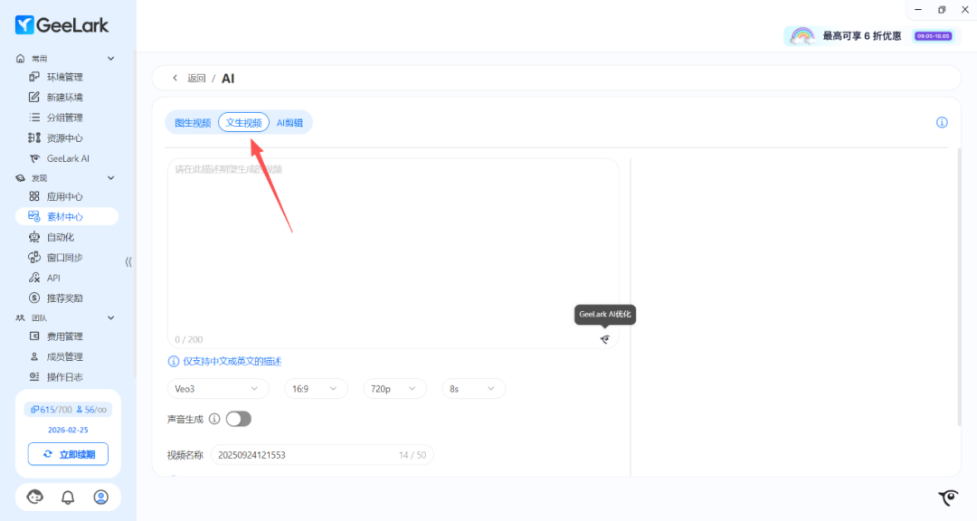 在 GeeLark 最新版本中,素材中心 - AI 模块新增了「文生视频」功能,文生视频可以快速生成产品宣传片、广告创意视频,只需输入文字描述,就能生成一段视频。