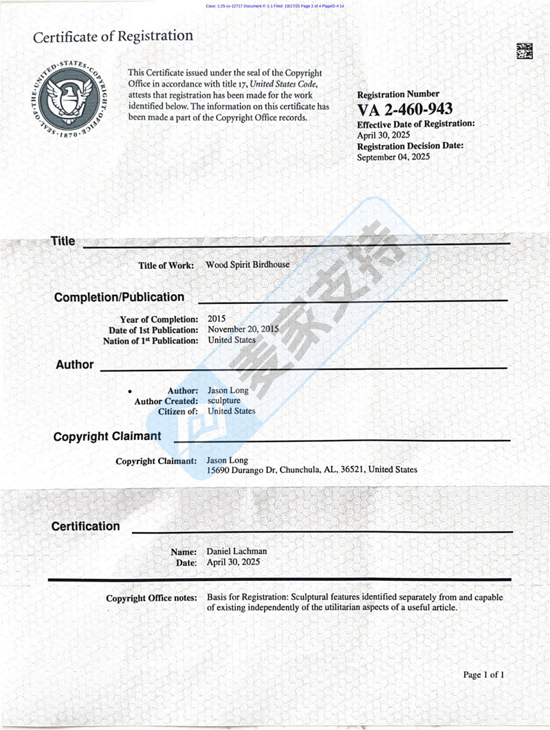本案是David代理Jason Long发起的版权维权案件,涉案版权号为:VA 2-460- 943,作品名称为木灵鸟舍,于2025年9月4日获得美国版权认证,可谓是下证即维权,目前该案件处于前期立案阶段,暂未获批TRO临时限制令,跨境卖家需注意排查下架高危产品!