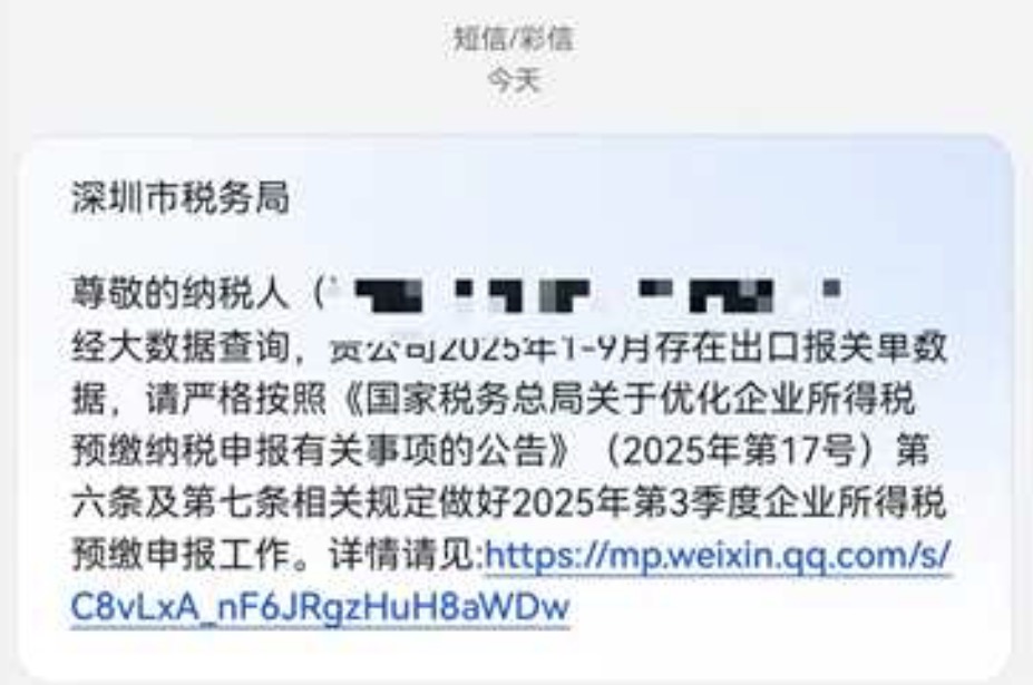 而长假后第一天,深圳税务局就通过短信向纳税人发出预警,要求严格按2025年第17号公告做好预缴申报。这波操作释放了什么信号?企业该如何应对?今天,我们就来深度剖析这一新规,帮你避开雷区! 一、新规背景:为什么国家突然“动真格”? 近年来,随着数字经济的爆发式增长,互联网平台企业的税务合规问题日益凸显。为堵住税收漏洞,国务院810号令打下基础,国税总局紧接着颁布了2025年第15号文(涉税信息申报规范)、17号文(企业所得税预缴优化),而9月28日的22号公告更是直指“行政处罚”,标志着监管从“劝诫”转向“亮剑”。简单说,国家就是要通过硬性处罚,倒逼平台企业如实报送涉税信息,防止偷漏税行为。 二、22号公告核心解读:情节严重直接停业,企业还敢马虎吗? 这份公告虽短,但条条致命。我们来划重点: 宽容期但非“免死金牌”:公告第一条明确,如果平台企业在税务机关责令限期内改正违规行为,可免于处罚。这给了企业缓冲空间,但千万别误解为“可以拖”——一旦超期,后果严重。 “情节严重”的六种情形:第二条细化了何为“情节严重”,包括年度内累计2次未报或漏报信息、瞒报谎报、违规引导收入分拆、伪造篡改信息、暴力抗拒报送等。这意味着,企业如果屡教不改或故意违规,可能面临停业整顿等重罚。 处罚执行层层加码:第三条和第四条指出,主管税务机关负责日常处罚,但停业整顿需报省级以上税务机关审批,并限制发票开具、通报监管部门。这种“联合执法”模式,彰显了跨部门协作的威慑力。 整改可“止损”:第五条规定,停业整顿期间积极整改并消除影响的企业,可申请停止处罚。这体现了惩教结合的原则,鼓励企业主动纠偏。 结合深圳税务局的短信提醒(要求按17号公告做好预缴申报),可见新规已进入实操阶段。大数据监测下,企业出口报关、收入确认等数据一旦异常,税务局将直接“点名”。互联网平台企业若仍抱侥幸心理,很可能撞上枪口。