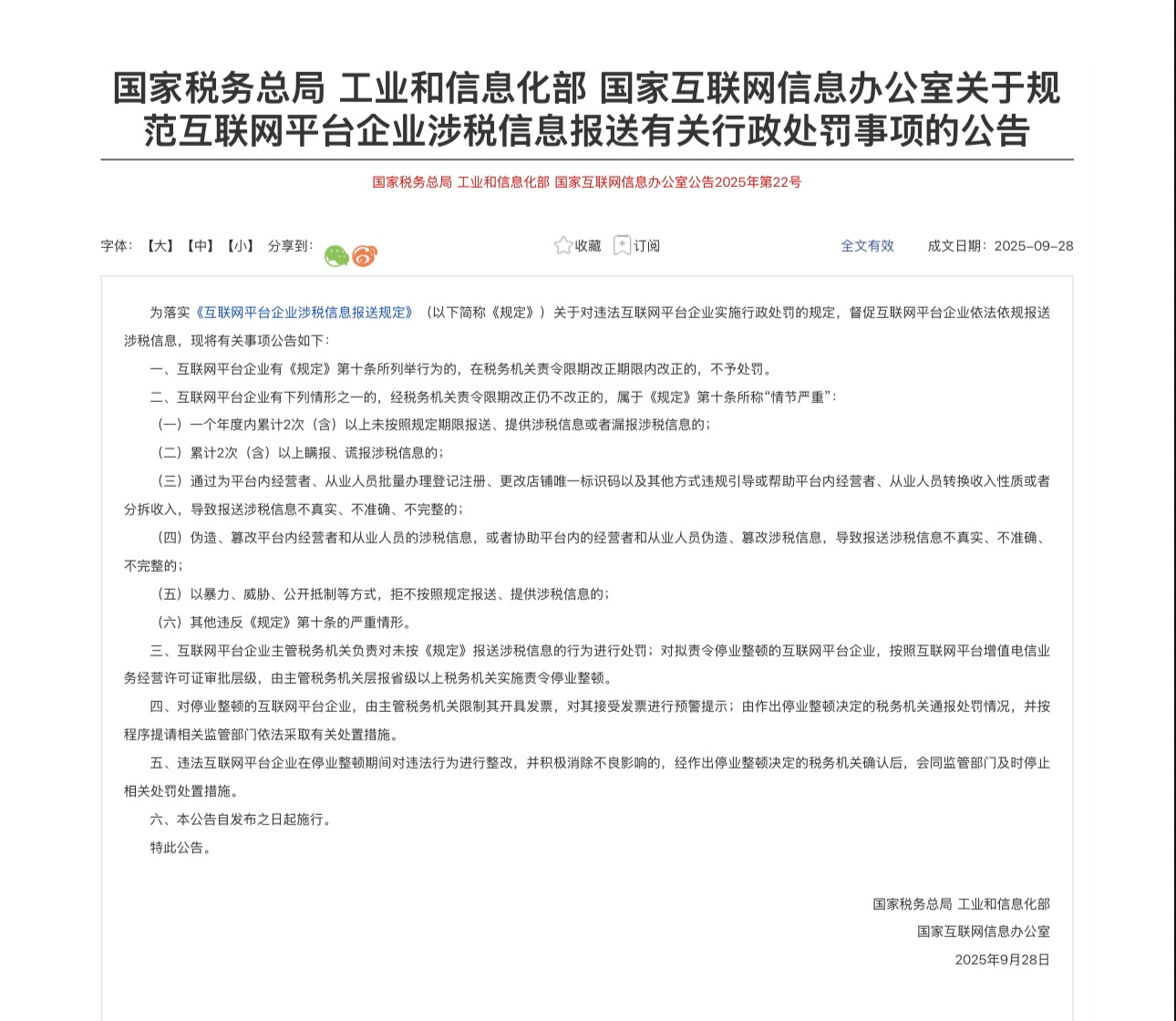 就在9月28日,国家税务总局、工业和信息化部、国家互联网信息办公室联合发布了《关于规范互联网平台企业涉税信息报送有关行政处罚事项的公告》(2025年第22号),这一重磅文件堪称互联网平台税务监管的“紧箍咒”。