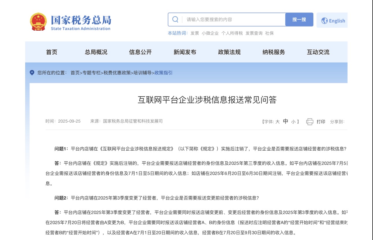 国家税务总局近日发布了《互联网平台企业涉税信息报送规定》相关常见问答,针对平台内店铺注销、经营者变更、虚拟货币收入确认等十大实操问题作出明确解释。这一细化为平台企业和平台内经营者提供了清晰的合规指引,也预示着平台经济税收监管进入精细化、规范化的新阶段。