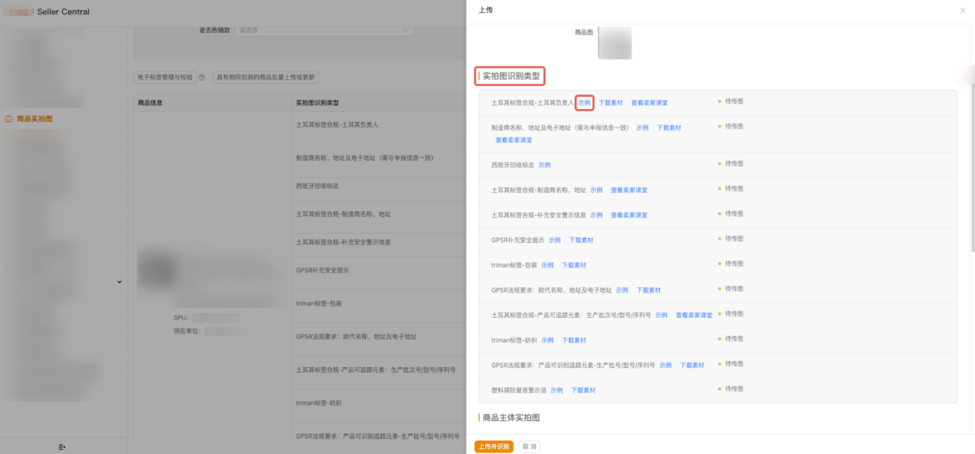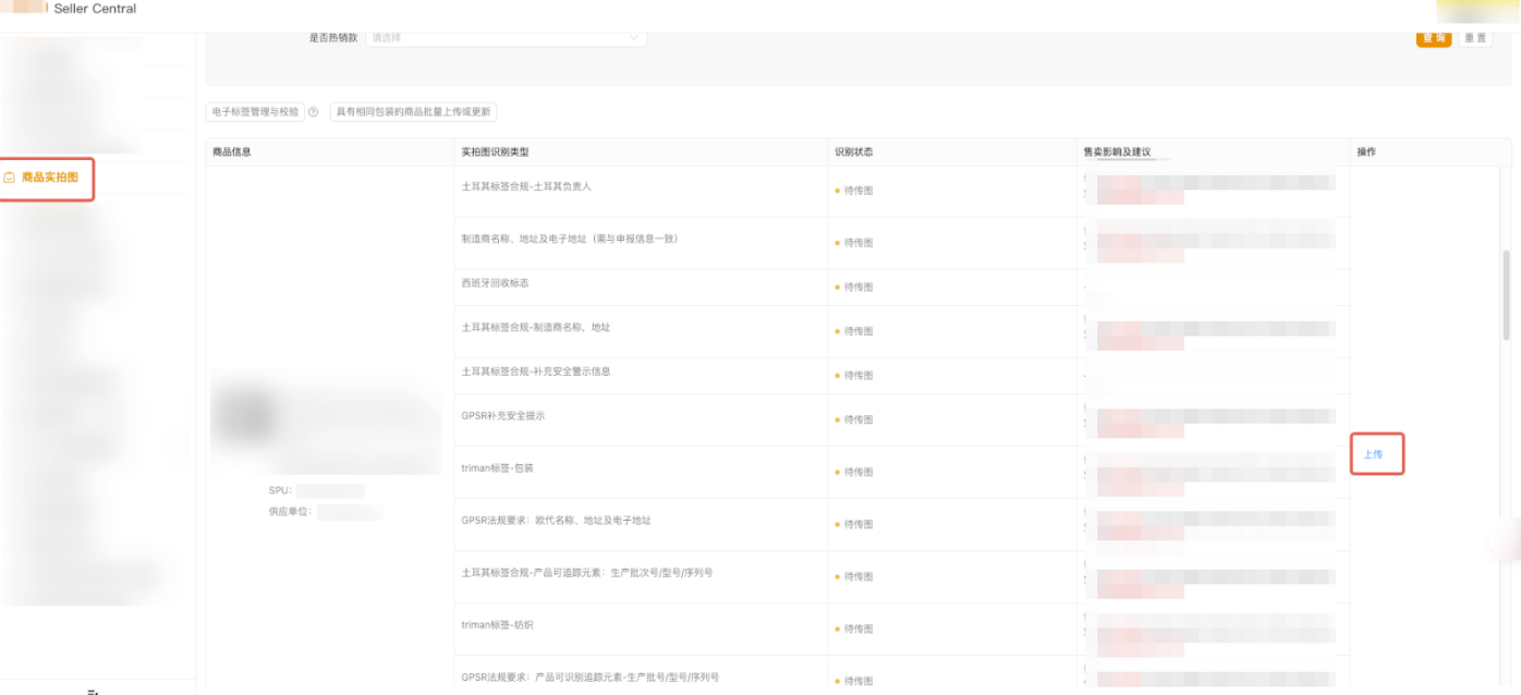 1. 进入【商家中心】-【合规服务】-【合规中心】-【商品实拍图】界面,找到您需上传商品标签的商品,并点击上传。 2. 进入上传界面后,查阅【实拍图识别类型】板块内容,同时可参考【示例】,您可以将该页所有商品标签相关的信息及其他您需添加的信息制作成电子标签。 再次提示:请确保商品标签至少完整包含本页面要求的所有信息。同时,您也负有确保标签符合其他所有适用法规的最终责任。 3. 生成电子版标签后,请将其上传至实拍图入口,直接点击【上传并识别】,并等待系统识别结果。注意:为确保流程顺畅,请勿重复点击或操作其他按钮,耐心等待识别完成。 4. 若您的电子版商品标签存在问题,则系统提示:“识别结果有异常,请及时整改实物图后重新上传,防止影响商品售卖”。请记录以下【红色提示内容】逐项查看问题说明,并参考【示例】中的要求进行相应整改。全部整改完成,点击关闭【X】退出该页面( 注意:不可点击【暂不处理】);电子版标签整改完成无问题后,请自行打印纸质版商品标签粘附在商品外包装上,或印刷于商品外包装上,再进行拍摄并上传。