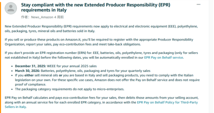意大利可谓是捅了合规的“窝”,近有VAT远有WEEE。已有大量卖家收到亚马逊要求完成意大利WEEE合规要求通知,合规期限为2025年12月31日,若在此之前未完成注册并提交,亚马逊将自动注册代扣代缴服务。