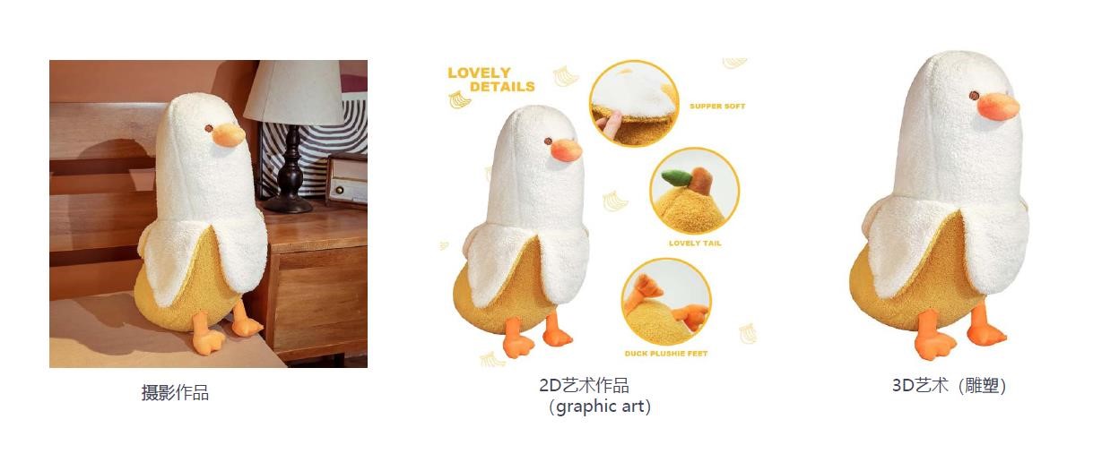 l 玩偶立体效果图或者白色背景下的立体实拍图→3D艺术作品(雕塑)。
