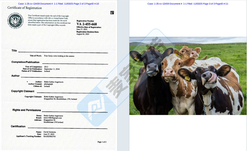 本案是keith律所代理冰岛艺术家Birkir Eythor Asgeirsson发起的版权维权案件,涉案版权号为:VA 2-455-668,于2025年6月27日获得美国版权认证,可谓是下证即维权!目前该案件处于前期立案阶段,暂未获批TRO临时限制令,跨境卖家速排查下架!