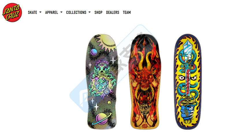 Santa Cruz 的滑板以精美的画工设计闻名,长期通过与独立艺术家合作,将涂鸦、漫画、超现实主义等元素融入板面设计,使每一块滑板都成为可收藏的街头艺术品。Santa Cruz 标志性的骷髅飞碟图案和嚎叫之手标志更是成为滑板文化的象征之一,影响着街头潮流的走向。目前,Santa Cruz 的产品线已涵盖服饰、轮子、支架等全方位装备,深受年轻消费者喜爱。