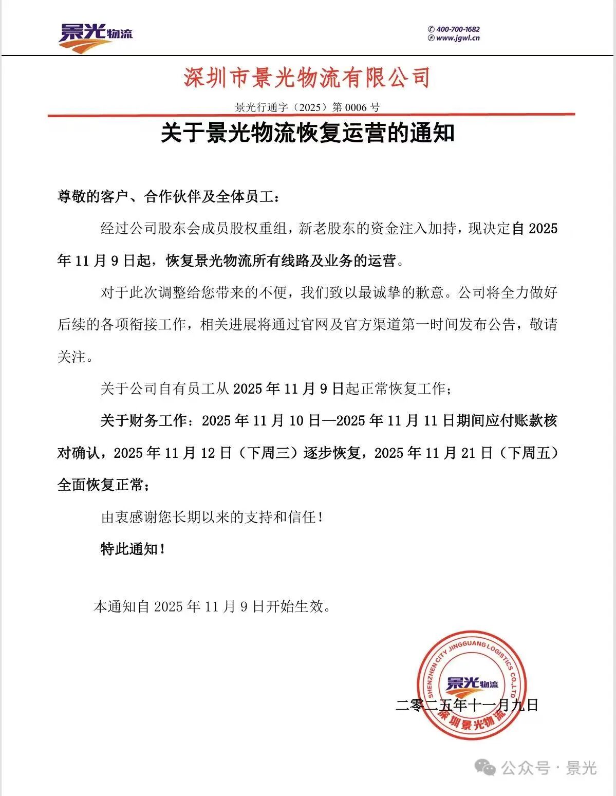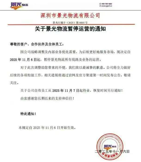 初海视野原创文章,转载请注明来源和出处 根据网上曝出的截图显示,11月6日,深圳市景光物流有限公司发出一封《关于景光物流暂停运营的通知》,表示因公司战略调整及内部业务优化需要,为后续更好地服务市场,决定自2025年11月6日起,暂停所有线路及业务的运营。同时,公司自有员工从2025年11月7日起待业,恢复时间另行通知! 这一停业通知令所有人愕然,一家员工超1000人的物流企业为何一夜之间就按下了暂停键? 据初海视野了解,深圳景光物流有限公司创建于2009年6月,经过十几年的发展,已成为国内一家集汽运、整车、仓储、配送为一体的一站式物流服务供应商。资料显示,景光物流运营本部位于广东东莞,目前拥有100多家营业部,200多台自有营运车辆,管理团队及超过1000名员工。拥有国内汽运、城际快运以及整车运输三种运输方式,建立了以广州、东莞为中心,以珠三角为重点,辐射全国的服务运营体系,可直达国内400多个大中城市。曾被评为“中国最具竞争力物流企业10强”、“2009年度中国最具诚信度物流企业30强”。 目前景光物流的官网显示正常,初海视野根据官网显示的全国客服热点拨打电话,一直提示座机繁忙状态。 今年6月份,景光物流还举办了盛大的16周年庆典,总经理发表了周年寄语:“16年来,我们始终坚守‘以创新推动中国物流发展,成为企业发展的助推器’的使命。……展望未来,物流行业将迎来更多的机遇与挑战。智能化、绿色化、国际化将成为物流行业发展的新趋势。” 未曾想,半年之后,1000多名员工却收到景光物流发出的停业通知。 抢占2026先机!义乌跨境电商盛会11月25日开启。携手亿级大卖与平台官方,闭门分享税务合规核心策略与旺季爆单打法,前瞻未来行业红利。席位有限,点击立即报名2025跨境电商产业带峰会-义乌站! 有行业人士指出,景光物流的突然停业可能跟其近几年的无序扩张有关,盲目增设分支机构、拓宽业务领域,这种盲目的扩张行为,往往使得管理难度大幅攀升,服务质量下滑,客户流失,最终资金链陷入紧张甚至断裂。 初海视野查看其官网及有关动态发现,从2020年开始,景光物流在广州、东莞、汕头、中山、深圳、珠海、惠州、梅州、佛山、湛江、茂名、江门等地大量铺设营业部和网点,巅峰时期有100多家营业部在运转,200多台自有营运车辆,管理团队及员工总人数超过1000。如此庞大的团队,如果没有良好的管理机制,内部会产生巨大的损耗。 幸运的是,景光物流没有完全走入绝境,事件在近期又有了转机。 根据景光物流的最新通知,经过股东会成员股权重组和新资金的注入,景光物流决定自11月9日起全面恢复运营。这意味着上千名员工的工作岗位得以保留,企业运营暂回正轨。 如果此次没有及时重组和新资金的注入,景光物流可能会陷入另一种境地,上千名员工的工作生活都将受到影响。 实际上,2025年,全球物流行业都面临运价下滑、人力成本上升等多重压力,不少物流企业出现资金链问题,进而大幅裁员。 11月,美国联合包裹服务公司(UPS)宣布在2025年累计裁员约4.8万人,其中运营岗位3.4万,管理层1.4万,并关闭大量运营网点。主要原因是亚马逊业务量减少,UPS减少对亚马逊的物流依赖(业务量下降21.2%),计划到2026年将亚马逊业务量削减50%以上。再者是应对关税政策不确定性以及优化成本结构的需要。 UPS在财报中明确指出,"特朗普关税引发的宏观环境不确定性"导致其难以预测业绩,并预计快递需求将因此走弱。阿波罗全球管理公司也预测,关税可能扰乱贸易,降低货运量,进而引发卡车运输等行业的大规模裁员。 德国物流巨头敦豪(DHL)早在今年3月份就宣布计划裁员8000人,主要集中在德国的邮政和包裹部门。DHL首席执行官托比亚斯·迈耶在一份声明中表示:“我们预计2025年全球政治和经济形势仍将动荡不安。”