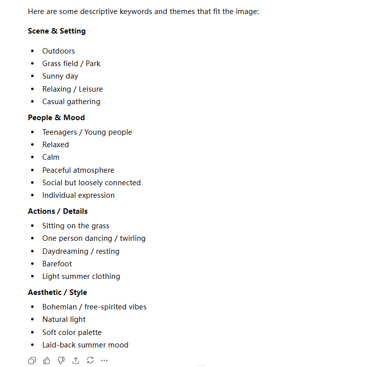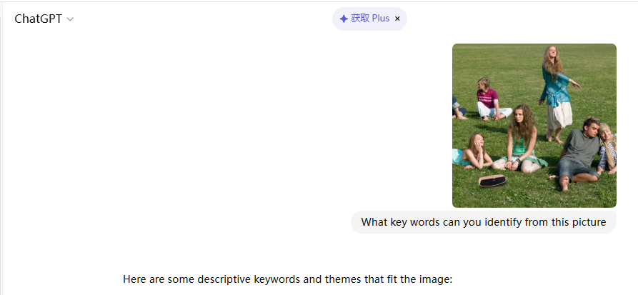 比如我上传了一张草地上的图,询问“What key words can you identify from this picture(这张图片中识别出哪些关键词)”