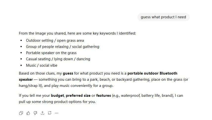 也可以将图片放到亚马逊Rufus对话框,通过图片让Rufus猜测你想要购买什么产品,来验证图片的视觉埋词是否正确。
