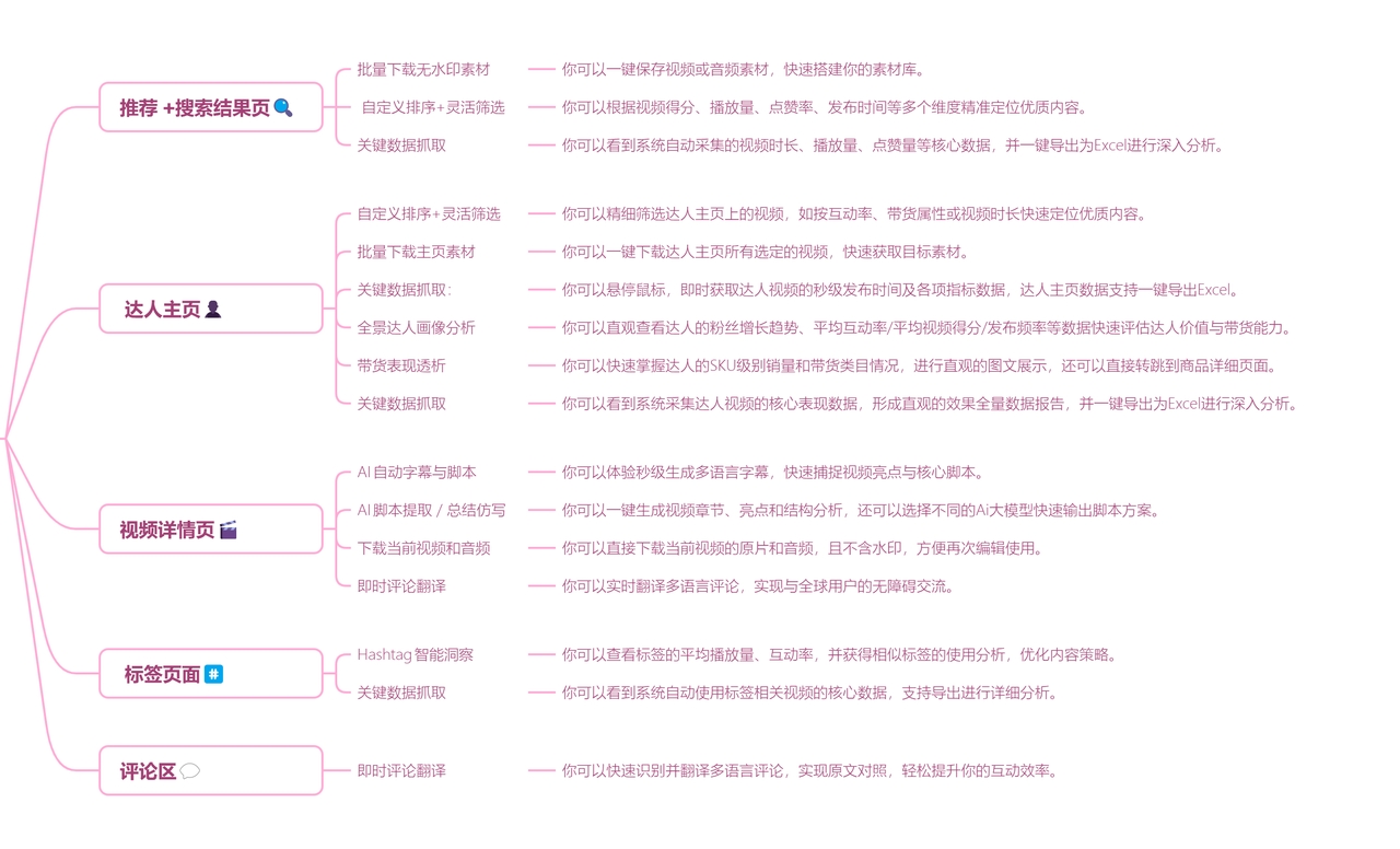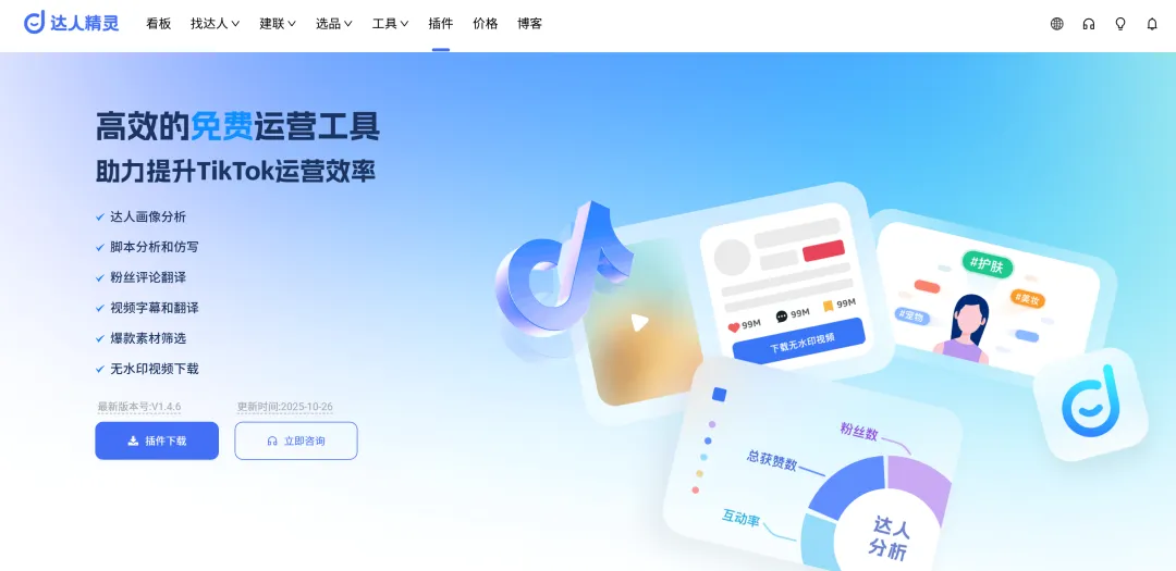 达人精灵集成了无水印下载、爆款素材筛选、AI 脚本拆解与仿写、达人带货分析、智能合作建议、评论翻译等功能,日常选品与素材复刻效率会直接上来。