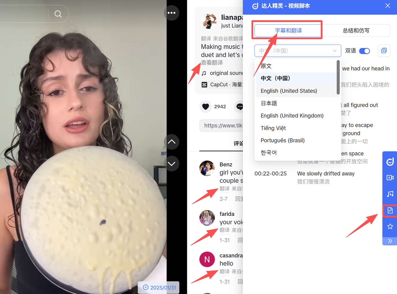 同时,达人精灵也有评论和视频的 AI 翻译与时间轴对齐功能,对小语种的视频理解非常友好。