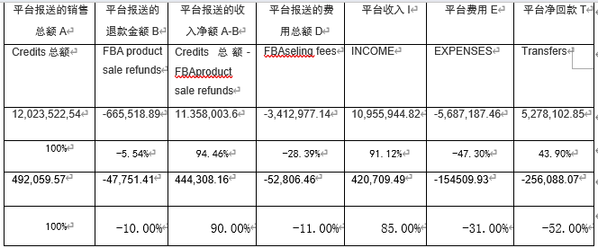 以一个亚马逊平台Amazon为例,目前Amazon平台给客户相关报告有两个,一个是SUMMARY REPORT报告和另一个是账期报告,现在亚马逊平台报送的是销售总额Credits总额,约为12,023,522.54美元,而扣款只报送了销售产品(FBA transaction fee refunds)的退款,其实还有各项Othe transaction fee refunds,Shipping label purchase refunds,FBA transaction fee refunds等这一类退款没有扣除,而平台费用也只报送了平台俑金,而仓储费用扣款、运费扣款都没有报送。