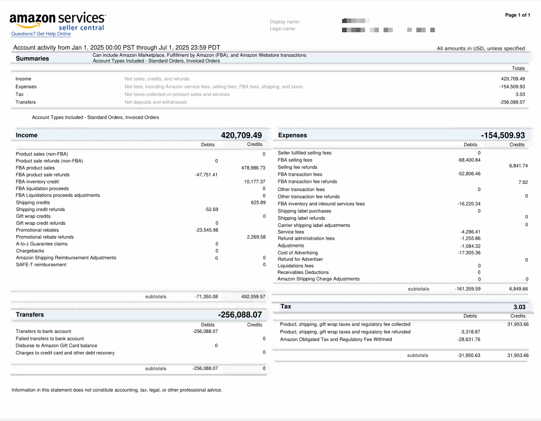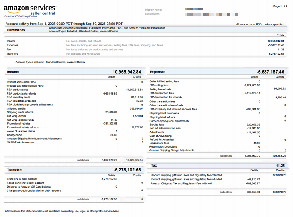 上图公司2025年9月亚马逊店铺数据显示,平台销售总额(Credits总额)为12,023,522.54美元,退货退款为665,518.89美元,净销售额为11,358,003.65美元。而平台最终回款(Transfers)仅为5,278,102.65美元,占销售总额的43.90%。