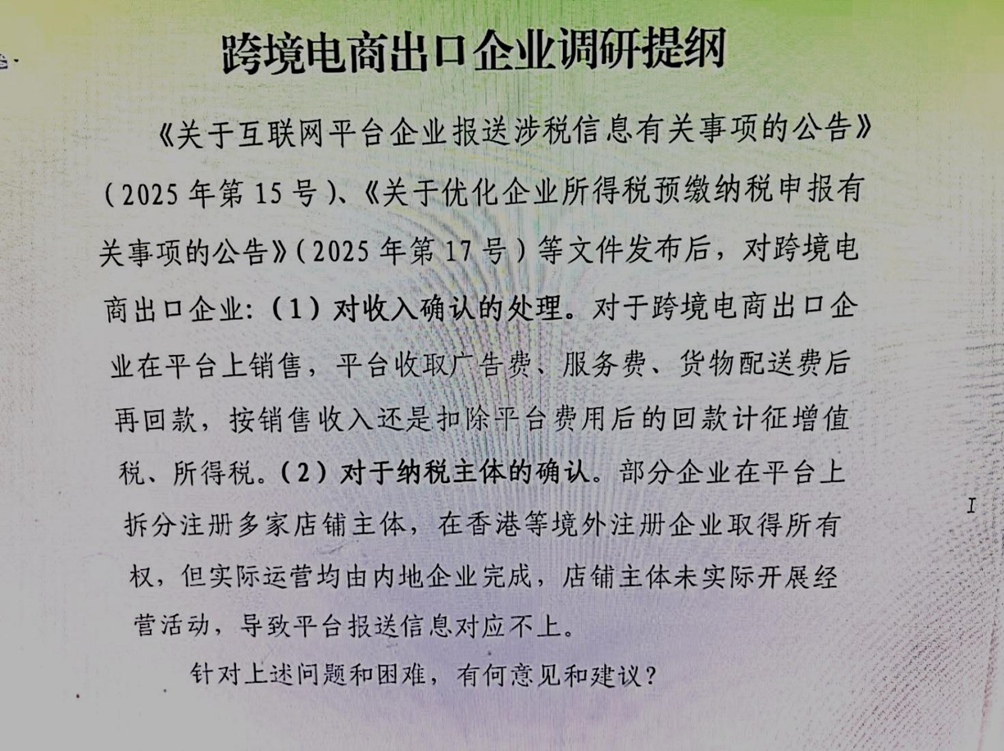 摘要:当平台数据与纳税申报“撞车”,S务部门主动发出调研提纲,跨境电商企业迎来合规自救的关键窗口期。读懂政策深意、找准合规路径,才能化危机为转机。