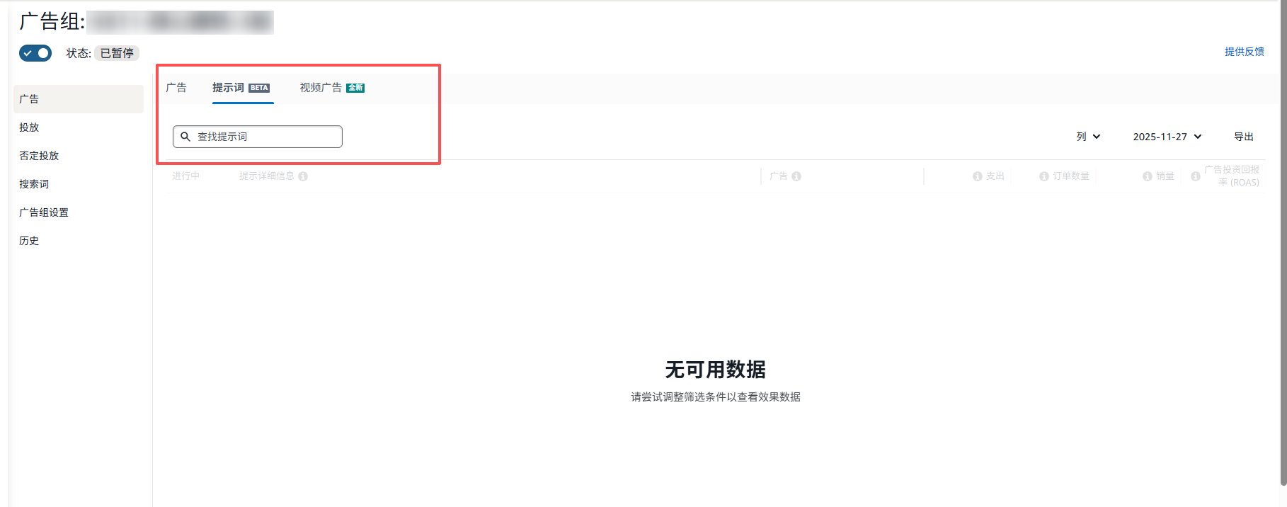 具体路径如下:登录广告后台,依次进入 “广告活动” → 点击“广告” → 找到提示词页面。