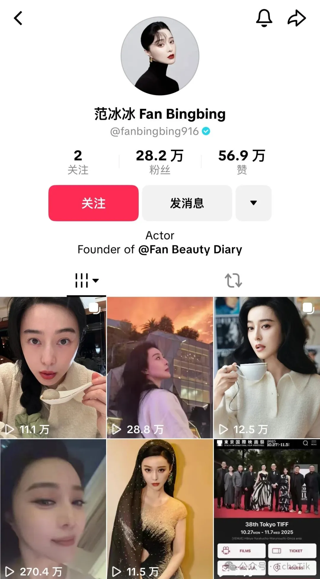 范冰冰本人的TikTok账号@fanbingbing916,目前已经积累了28.2万的粉丝量。