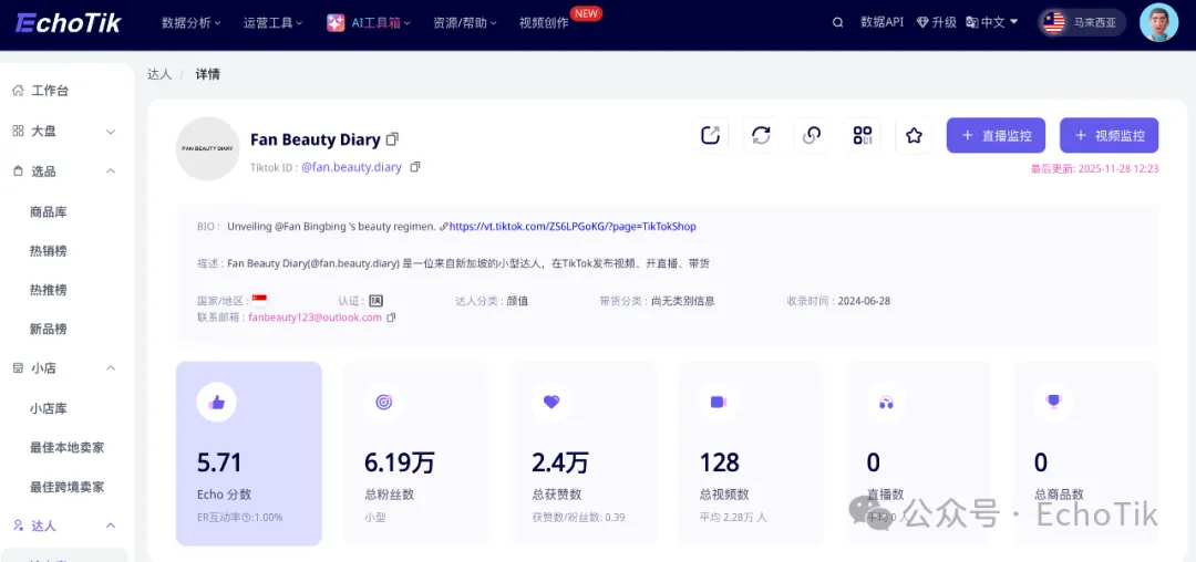 FBD 的出海起点是 2024 年 5 月登陆 Lazada,随后在 6 月开通 TikTok 账号,开始以短视频和明星内容建立基础声量。真正的爆发来自下半年,品牌加快直播节奏,与本地主播合作做带货,声量和销量才明显拉升。到了 2024 年底,首次东南亚直播引发关注,打开了更大的增量窗口。