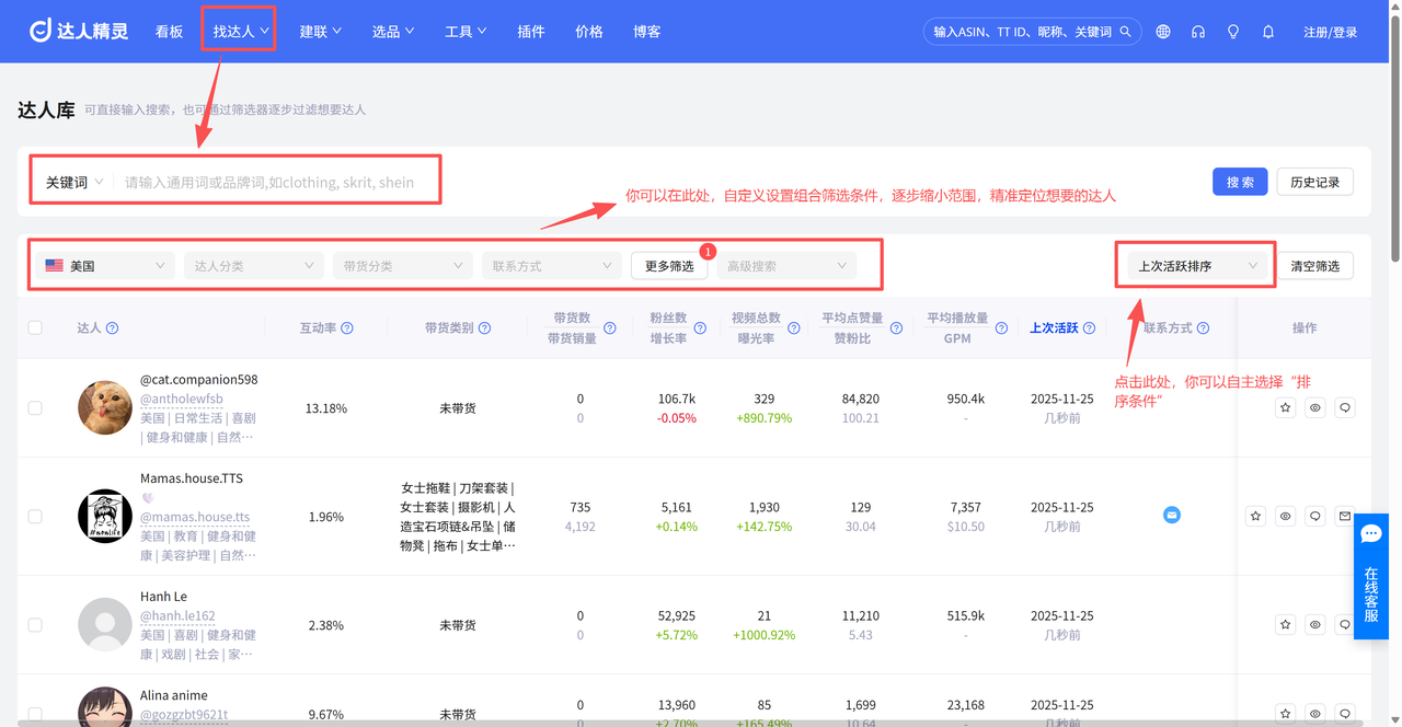 多场景覆盖的达人发现与精准挖掘:达人精灵的「找达人」功能,提供“热门/新兴/互动带货达人排行榜”等全方位的达人数据榜单,能够帮助跨境卖家快速发现意向达人;同时,它还汇集了TK平台海量达人资源,提供「达人搜索」模式,通过输入关键词及多维条件筛选模式,让跨境卖家可以精准筛选垂类精准达人;