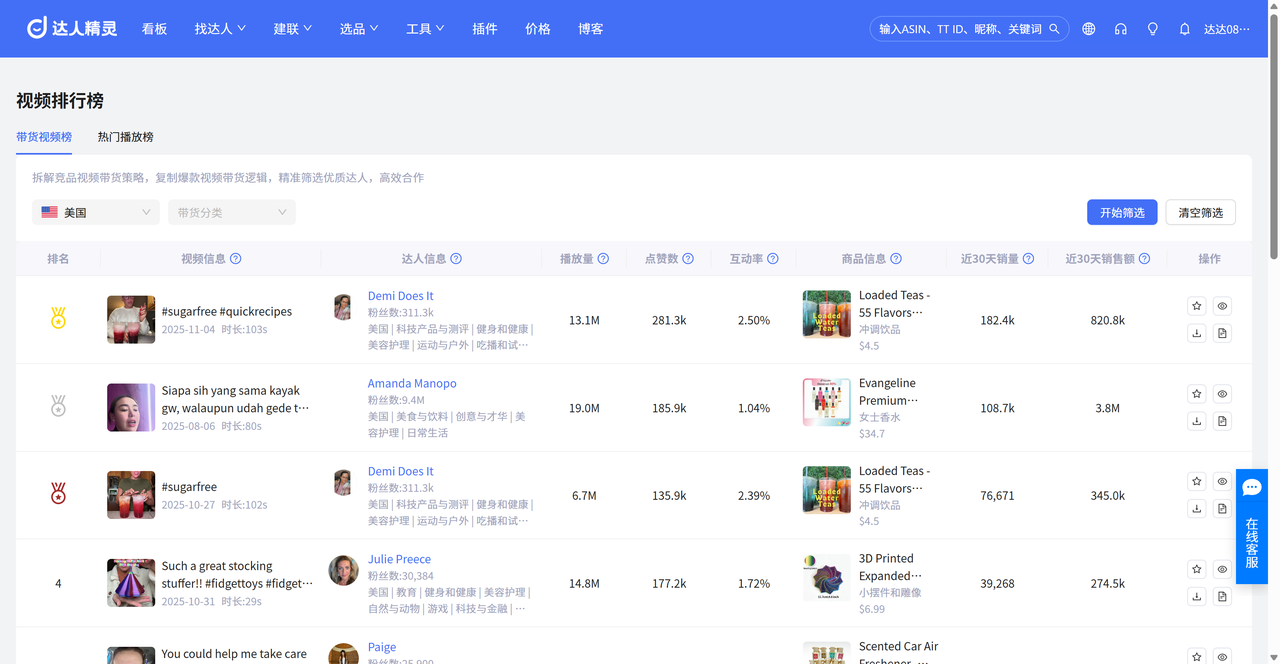 在TikTok Shop内,与达人合作是引爆流量的关键,达人精灵深度整合TK海量达人资源,提供多维度达人榜单,如热门/新兴/互动带货达人排行榜,能够帮助跨境卖家快速发现意向达人。