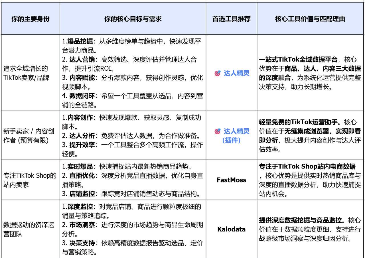 如果你是追求全域增长的TikTok品牌/跨境卖家 → 推荐“达人精灵网页版”(数据全面、分析深度、业务场景全覆盖)