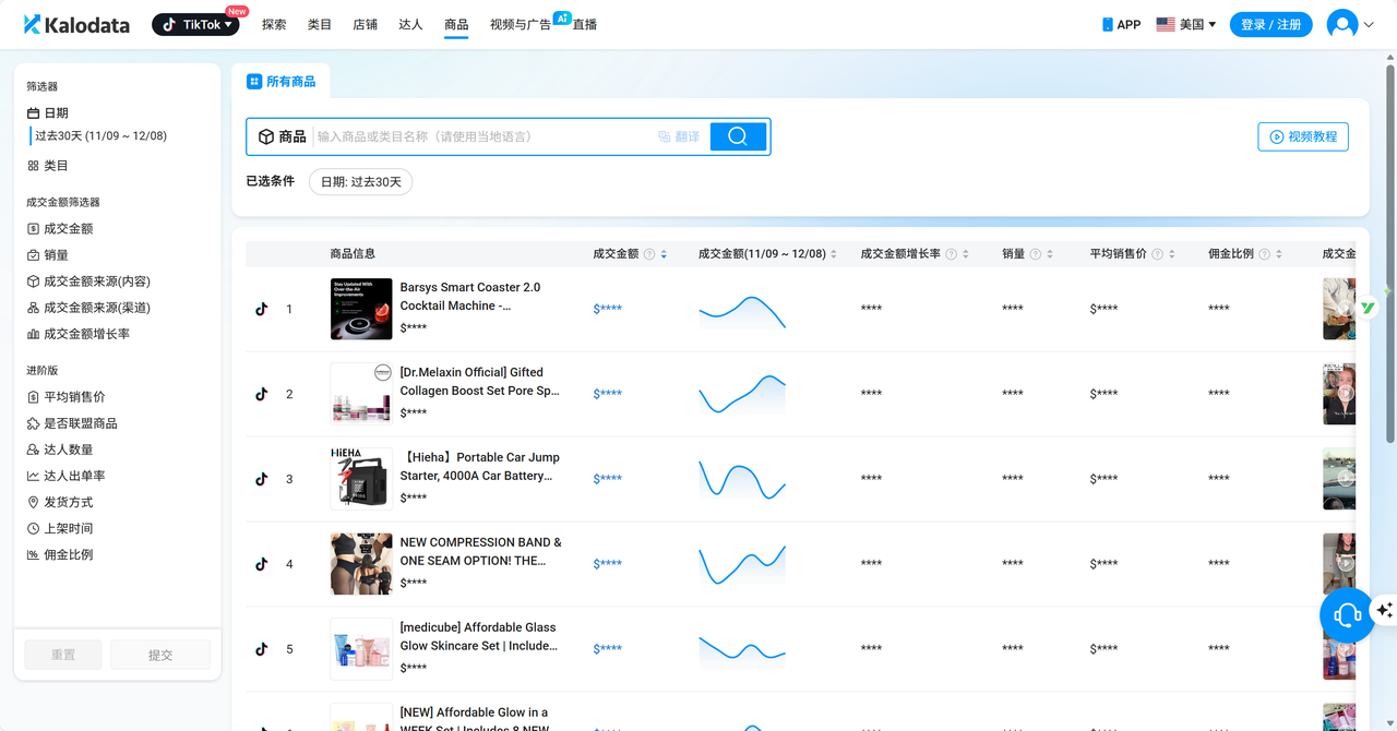 达人精灵汇集了TK平台亿级商品数据,提供商品销量榜、新兴爆品榜、热推销量榜等多维精选榜单,支持商品搜索及多维条件过滤,帮助卖家快速洞察市场趋势,快速定位潜力商品,精准把握涨得快、需求高、竞争小的市场新机会。