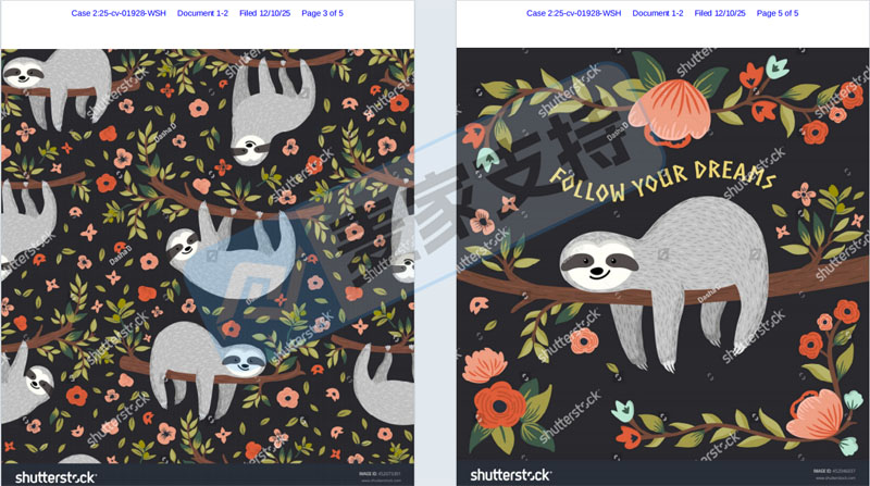 本案是Whitewood律所代理Sci Spark LLC发起的版权维权案件,涉案版权为两张于2025年1月7日获得版权认证的2张倒挂在树上的树懒版权作品,版权号为:VA 2-444-531和VA 2-444-601。该图片被广泛用于家居装饰以及生活日常用品等多个领域,未经授权使用则会面临TRO冻结风险,跨境卖家需尽快排查下架相似产品,避免TRO冻结风险。