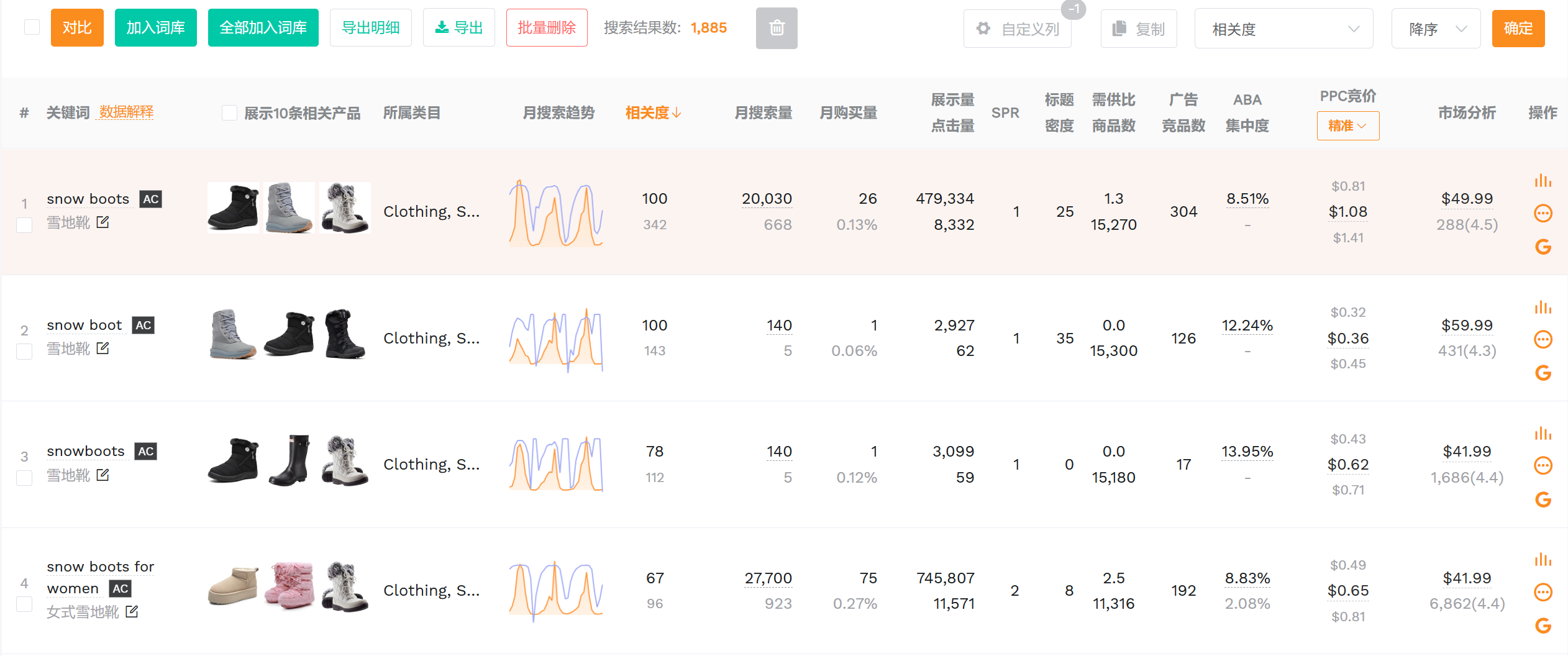在卖家精灵【关键词挖掘】中,输入产品“核心词”,查询出可能匹配到的关键词,对于完全不相关的词根,考虑提前否定。(比如卖“男士雪地靴”,用核心词“snow boots”查询,可能跑出“snow boots for women”,就可提前否定“women”这类词根。)