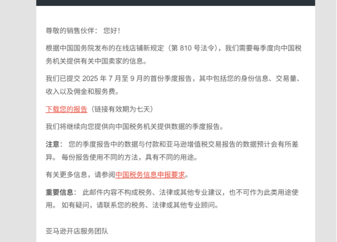 今天一早,无数亚马逊卖家的邮箱被同一封邮件惊醒。不是广告,不是促销,而是亚马逊直接告诉你:我们已经把你的经营数据同步给了中国税务机关。