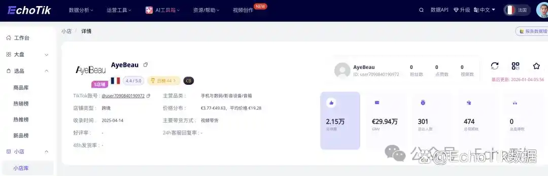 据Echotik数据显示,这款爆品出自一家名为AyeBeau的法国TikTok跨境店,自2025年年中上线以来,迅速成为这家店铺的头号爆款。