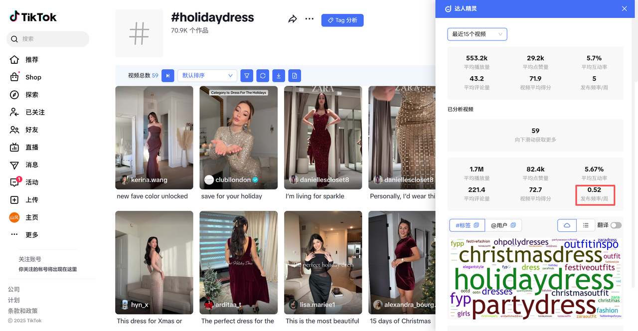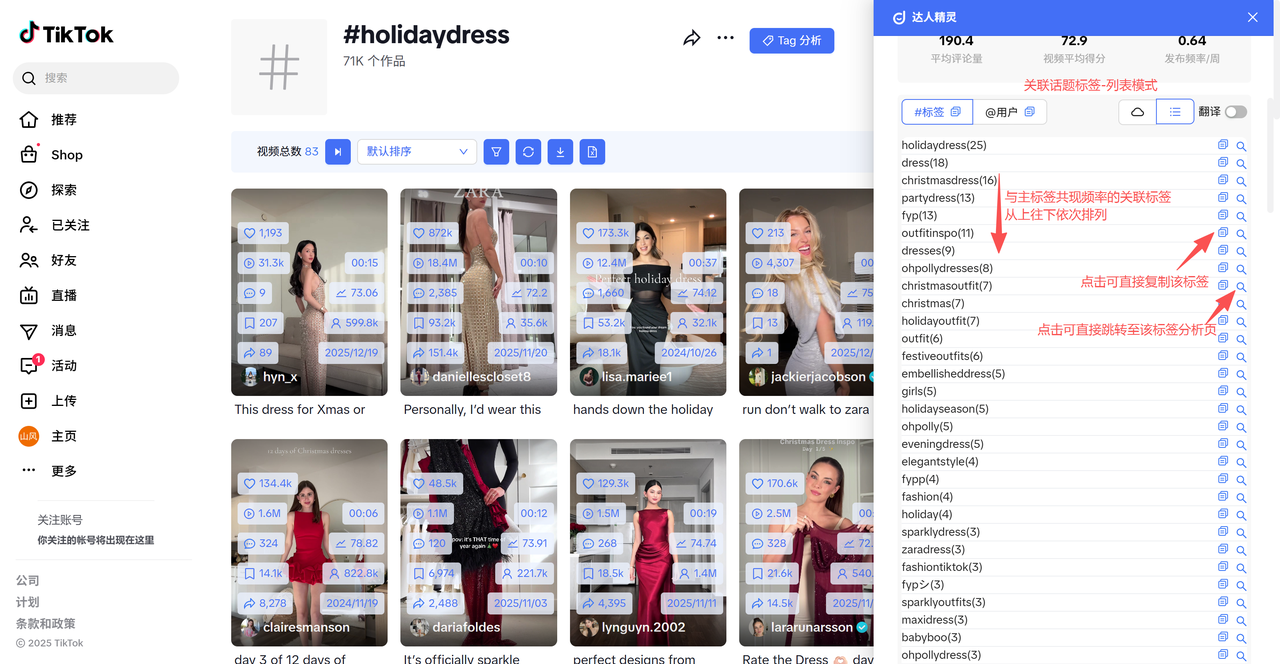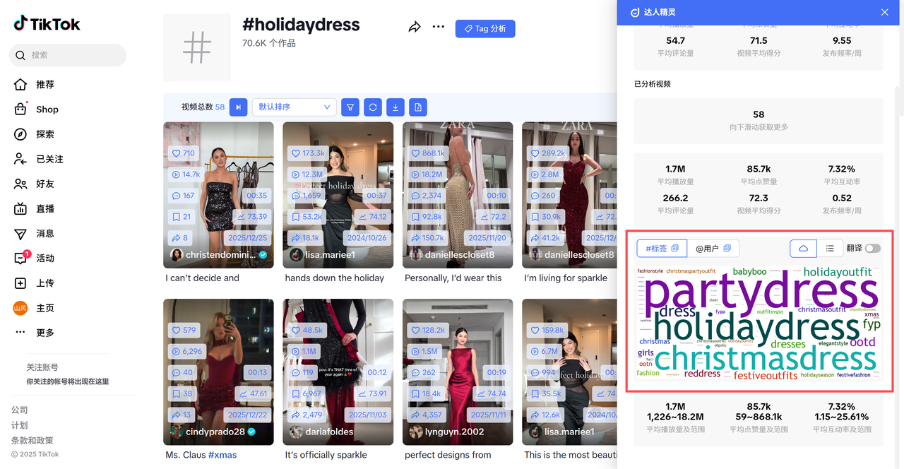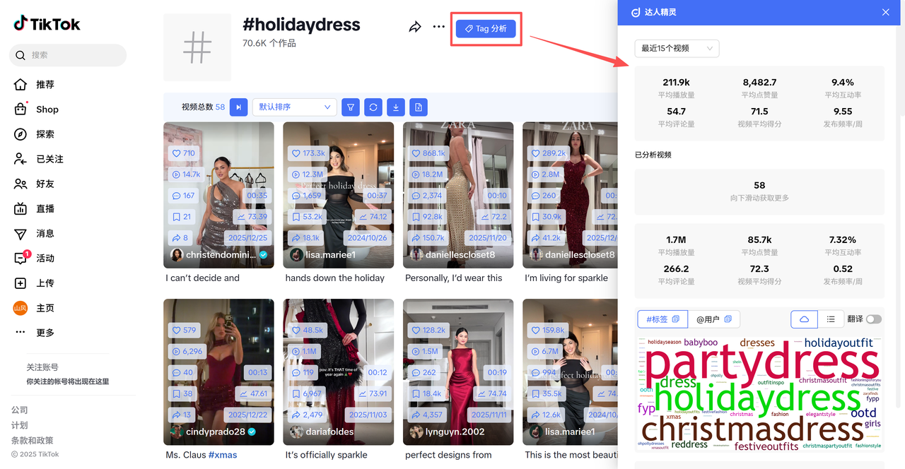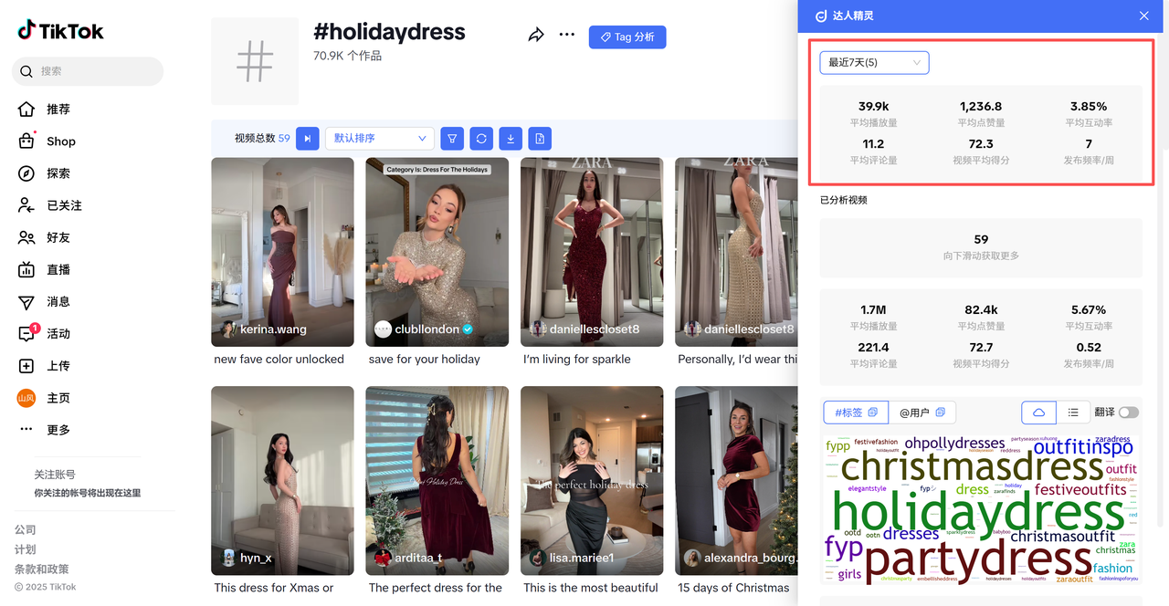 ③兴趣洞察:词云直接反映了关注此主标签的用户群体的其他兴趣点,比如在#holidaydress 主标签下,用户同时也对#partydress 与 #christmasdress 相关内容感兴趣;