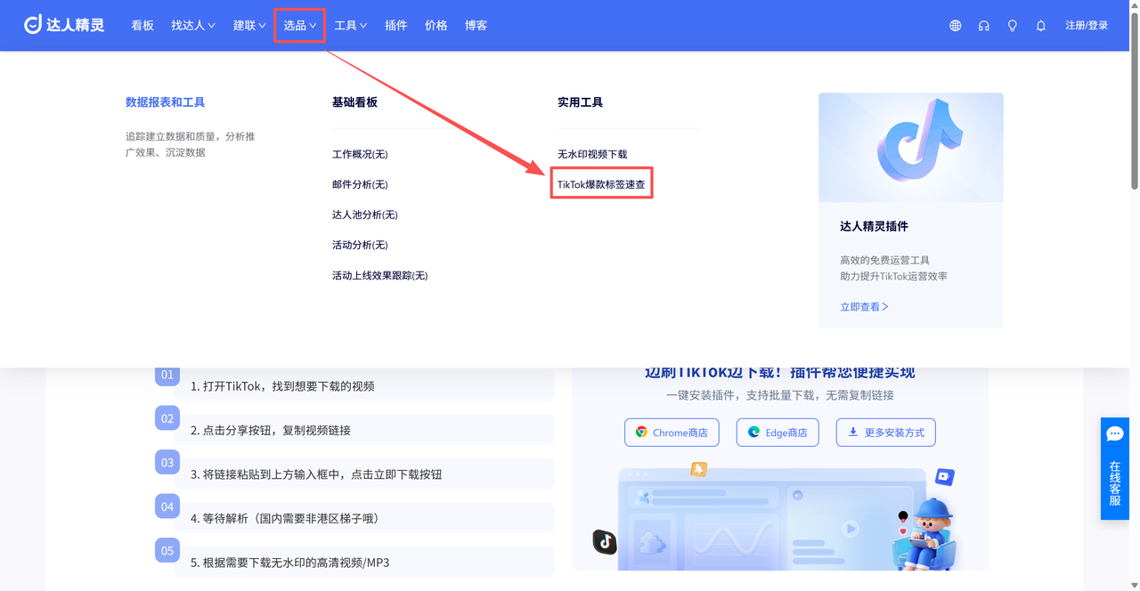 当你需要为视频寻找热门标签时,进入达人精灵网页端,在顶部导航栏中,找到「选品」下方的「TikTok爆款标签速查」功能。