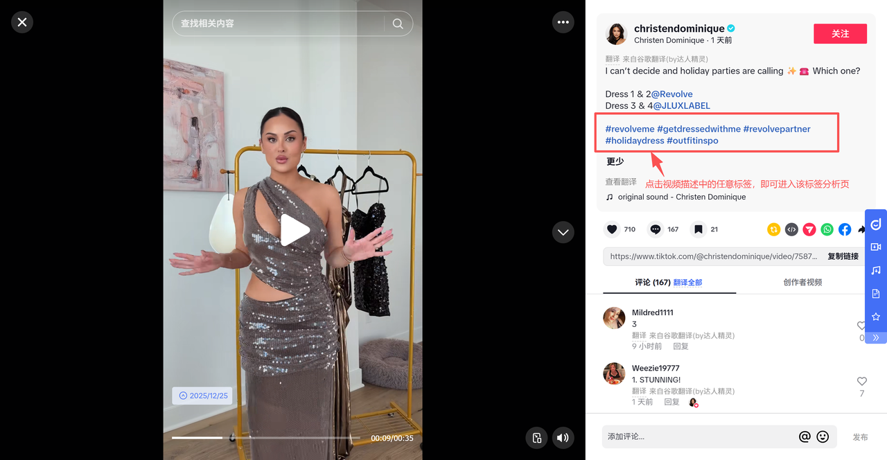 3.点击视频描述中的#标签,立即开启你的第一次数据驱动的标签分析!